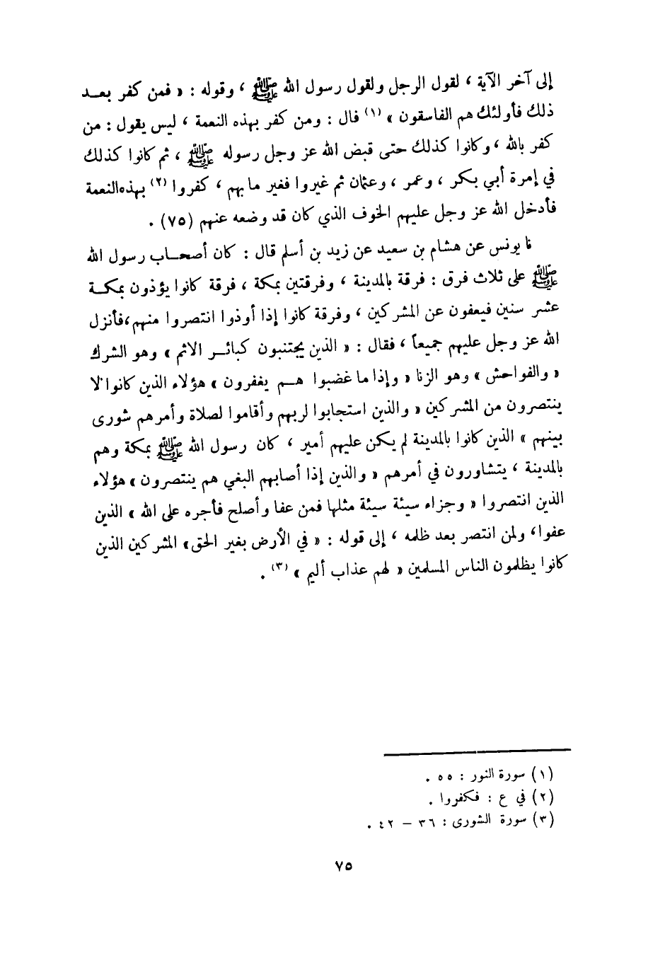 نا يونس عن هشام بن سعيد عن زيد بن أسلم قال: كان أصحاب رسول الله صلى الله عليه وسلم على ثلاث فرق: فرقة بالمدينة، وفرقتين بمكة، فرقة كانوا يؤذون بمكة عشر سنين فيعفون عن المشركين، وفرقة كانوا إذا أوذوا انتصروا منهم، فأنزل الله عز وجل عليهم جميعاً، فقال: «الَّذِينَ يَجْتَنِبُونَ كَبائِرَ الْإِثْمِ» وهو الشرك «وَالْفَواحِشَ» وهو الزنا «وَإِذا ما غَضِبُوا هُمْ يَغْفِرُونَ» هؤلاء الذين كانوا لا ينتصرون من المشركين «وَالَّذِينَ اسْتَجابُوا لِرَبِّهِمْ وَأَقامُوا الصَّلاةَ وَأَمْرُهُمْ شُورى بَيْنَهُمْ» الذين كانوا بالمدينة لم يكن عليهم أمير، كان رسول الله صلى الله عليه وسلم بمكة وهم بالمدينة، يتشاورون في أمرهم «وَالَّذِينَ إِذا أَصابَهُمُ الْبَغْيُ هُمْ يَنْتَصِرُونَ» هؤلاء الذين انتصروا «وَجَزاءُ سَيِّئَةٍ سَيِّئَةٌ مِثْلُها فَمَنْ عَفا وَأَصْلَحَ فَأَجْرُهُ عَلَى اللَّهِ» الذين عفوا، ولمن انتصر بعد ظلمه، إلى قوله: «فِي الْأَرْضِ بِغَيْرِ الْحَقِّ» المشركين الذين كانوا يظلمون الناس المسلمين «لَهُمْ عَذابٌ أَلِيمٌ» «3» .