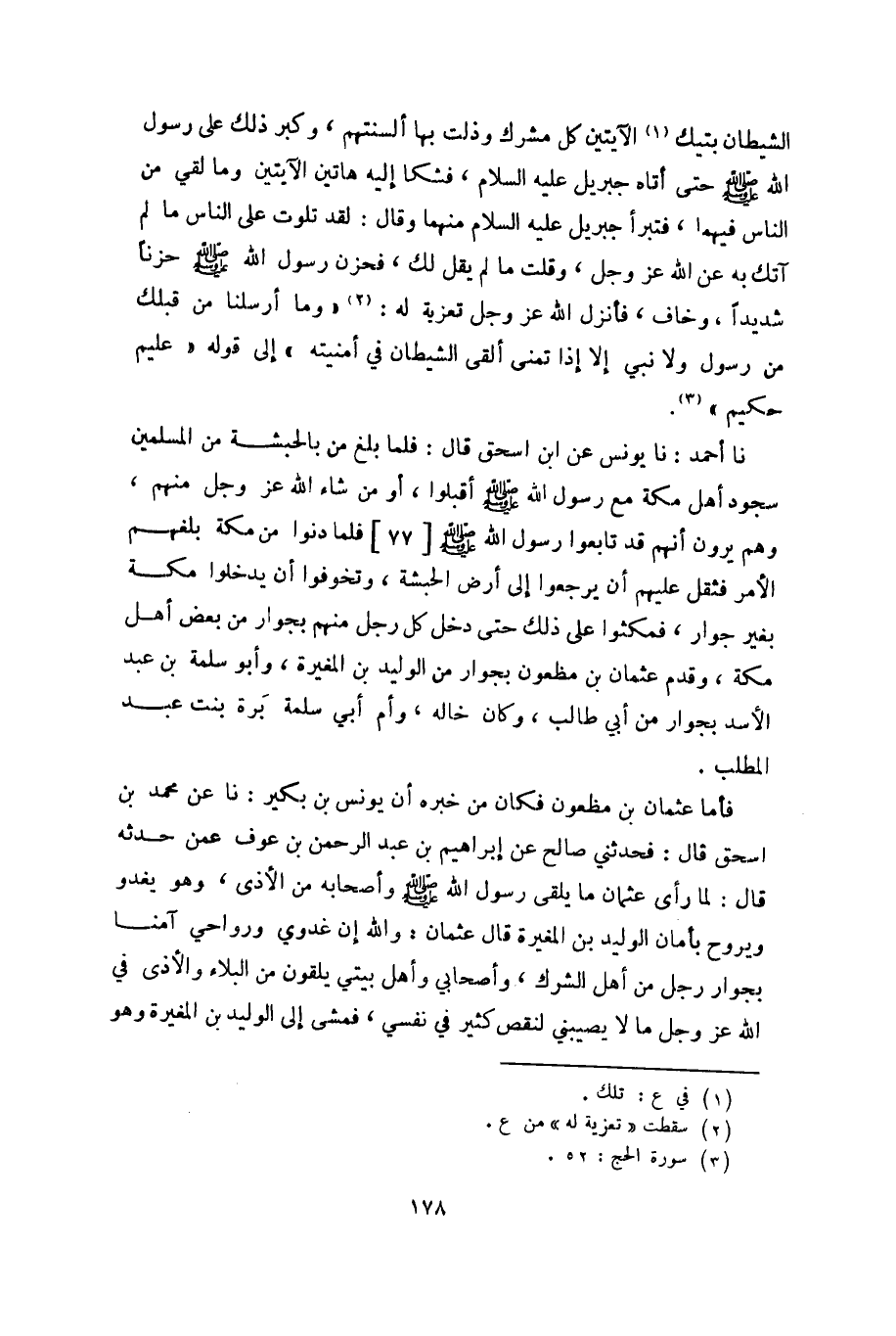 نا أحمد: نا يونس عن ابن إسحق قال: فلما بلغ من بالحبشة من المسلمين سجود أهل مكة مع رسول الله صلى الله عليه وسلم أقبلوا، أو من شاء الله عز وجل منهم، وهم يرون أنهم قد تابعوا رسول الله صلى الله عليه وسلم [77] فلما دنوا من مكة بلغهم الأمر فثقل عليهم أن يرجعوا إلى أرض الحبشة، وتخوفوا أن يدخلوا مكة بغير جوار، فمكثوا على ذلك حتى دخل كل رجل منهم بجوار من بعض أهل مكة، وقدم عثمان بن مظعون بجوار من الوليد بن المغيرة، وأبو سلمة بن عبد الأسد بجوار من أبي طالب، وكان خاله، وأم أبي سلمة برة بنت عبد المطلب.