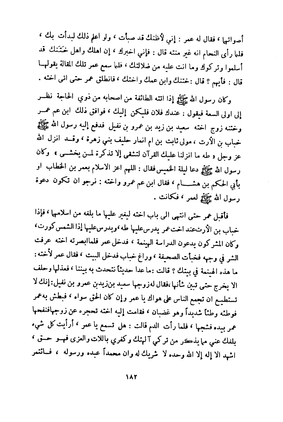 ما هذه الهينمة في بيتك؟ قالت: ما عدا حديثاً نتحدث به بيننا، فعذلها وحلف الا يخرج حتى تبين شأنها، فقال له زوجها سعيد بن زيد بن عمرو بن نفيل: إنك لا تستطيع ان تجمع الناس على هواك يا عمر وإن كان الحق سواه، فبطش به عمر فوطئه وطئاً شديداً وهو غضبان، فقامت إليه اخته تحجره عن زوجها فنفحها عمر بيده فشجها، فلما رأت الدم قالت: هل تسمع يا عمر، أرأيت كل شيء بلغك عني مما يذكر من تركي آلهتك وكفري باللات والعزى فهو حق، اشهد الا إله إلا الله وحده لا شريك له وأن محمدا عبده ورسوله، فائتمر