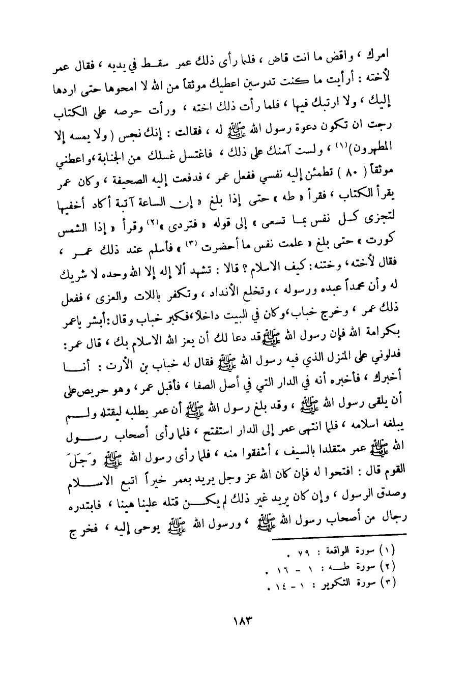 امرك، واقض ما انت قاض، فلما رأى ذلك عمر سقط في يديه، فقال عمر لأخته: أرأيت ما كنت تدرسين اعطيك موثقاً من الله لا امحوها حتى اردها إليك، ولا اريبك فيها، فلما رأت ذلك اخته، ورأت حرصه على الكتاب رجت ان تكون دعوة رسول الله صلى الله عليه وسلم له، فقالت: إنك نجس (لا يَمَسُّهُ إِلَّا الْمُطَهَّرُونَ) «1» ، ولست آمنك على ذلك، فاغتسل غسلك من الجنابة، واعطني موثقاً (80) تطمئن إليه نفسي ففعل عمر، فدفعت إليه الصحيفة، وكان عمر يقرأ الكتاب، فقرأ «طه» حتى إذا بلغ «إِنَّ السَّاعَةَ آتِيَةٌ أَكادُ أُخْفِيها لِتُجْزى كُلُّ نَفْسٍ بِما تَسْعى» إلى قوله «فَتَرْدى» «2» وقرأ «إِذَا الشَّمْسُ كُوِّرَتْ» حتى بلغ «عَلِمَتْ نَفْسٌ ما أَحْضَرَتْ «3» » فأسلم عند ذلك عمر، فقال لأخته، وختنه: كيف الاسلام؟ قالا: تشهد ألا إله إلا الله وحده لا شريك له وأن محمدا عبده ورسوله، وتخلع الآنداد، وتكفر باللات والعزى، ففعل ذلك عمر، وخرج خباب، وكان في البيت داخلاً، فكبر خباب وقال: أبشر يا عمر بكرامة الله فإن رسول الله صلى الله عليه وسلم قد دعا لك أن يعز الله الاسلام بك، قال عمر: