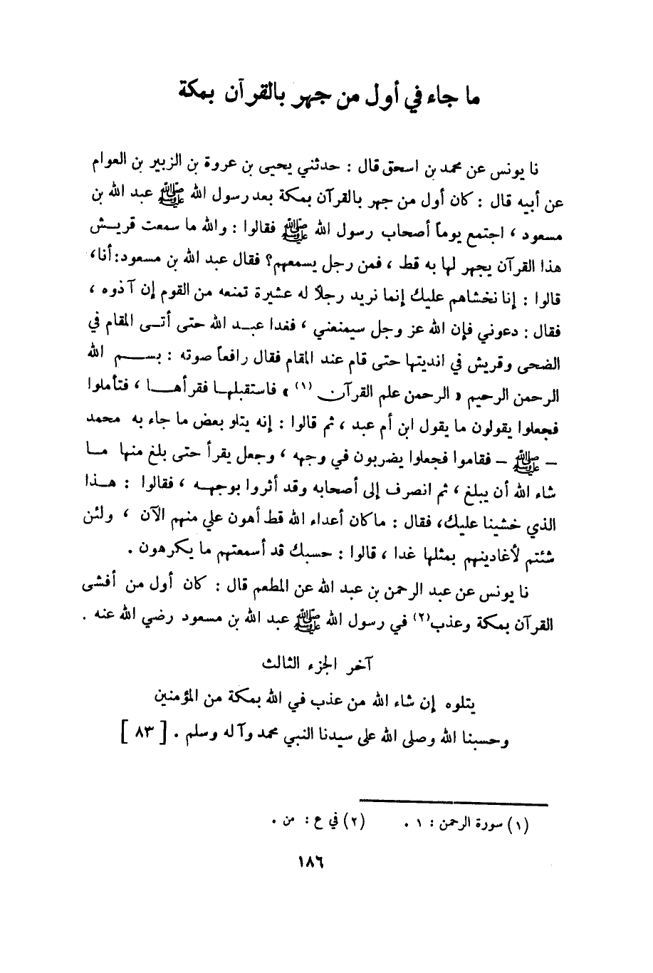 نا يونس عن محمد بن إسحق قال: حدثني يحيى بن عروة بن الزبير بن العوام عن أبيه قال: كان أول من جهر بالقرآن بمكة بعد رسول الله صلى الله عليه وسلم عبد الله بن مسعود، اجتمع يوماً أصحاب رسول الله صلى الله عليه وسلم فقالوا: والله ما سمعت قريش هذا القرآن يجهر لها به قط، فمن رجل يسمعهم؟ فقال عبد الله بن مسعود: أنا، قالوا: إنا نخشاهم عليك إنما نريد رجلاً له عشيرة تمنعه من القوم إن آذوه، فقال: دعوني فإن الله عز وجل سيمنعني، فغدا عبد الله حتى أتى المقام في الضحى وقريش في انديتها حتى قام عند المقام فقال رافعاً صوته: بسم الله الرحمن الرحيم «الرَّحْمنُ عَلَّمَ الْقُرْآنَ «1» » فاستقبلها فقرأها، فتأملوا فجعلوا يقولون ما يقول ابن أم عبد، ثم قالوا: إنه يتلو بعض ما جاء به محمد- صلى الله عليه وسلم- فقاموا فجعلوا يضربون في وجهه، وجعل يقرأ حتى بلغ منها ما شاء الله أن يبلغ، ثم انصرف إلى أصحابه وقد أثروا بوجهه، فقالوا: هذا الذي خشينا عليك، فقال: ما كان أعداء الله قط أهون علي منهم الآن، ولئن شئتم لأغادينهم بمثلها غدا، قالوا: حسبك قد أسمعتهم ما يكرهون.