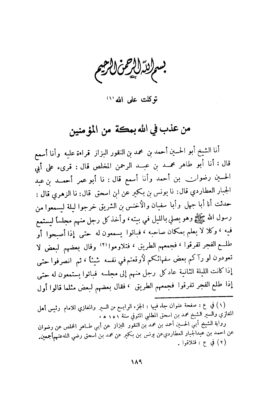 (1) في ع: صفحة عنوان جاء فيها: الجزء الرابع من السير والمغازي للامام رئيس أهل المغازي والسير الشيخ محمد بن إسحق المطلبي المتوفى سنة 151 هـ، رواية الشيخ أبي الحسين أحمد بن محمد بن النقور البزاز عن أبي طاهر المخلص عن رضوان عن أحمد بن عبد الجبار العطاردي عن يونس بن بكير عن محمد بن اسحق رضي الله عنهم أجمعين.