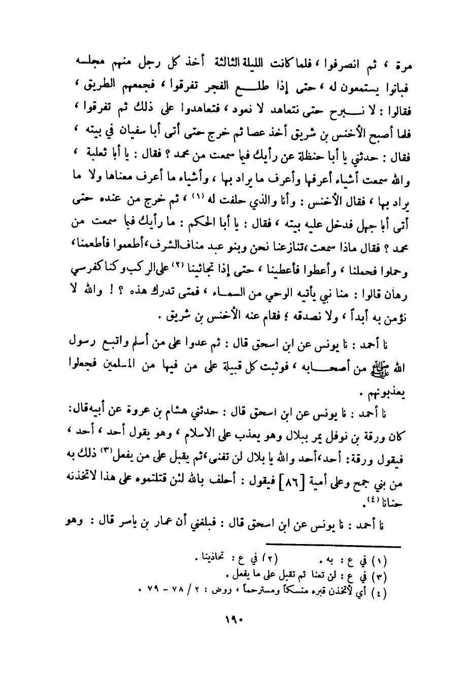 نا أحمد: نا يونس عن ابن إسحق قال: ثم عدوا على من أسلم واتبع رسول الله صلى الله عليه وسلم من أصحابه، فوثبت كل قبيلة على من فيها من المسلمين فجعلوا يعذبونهم.