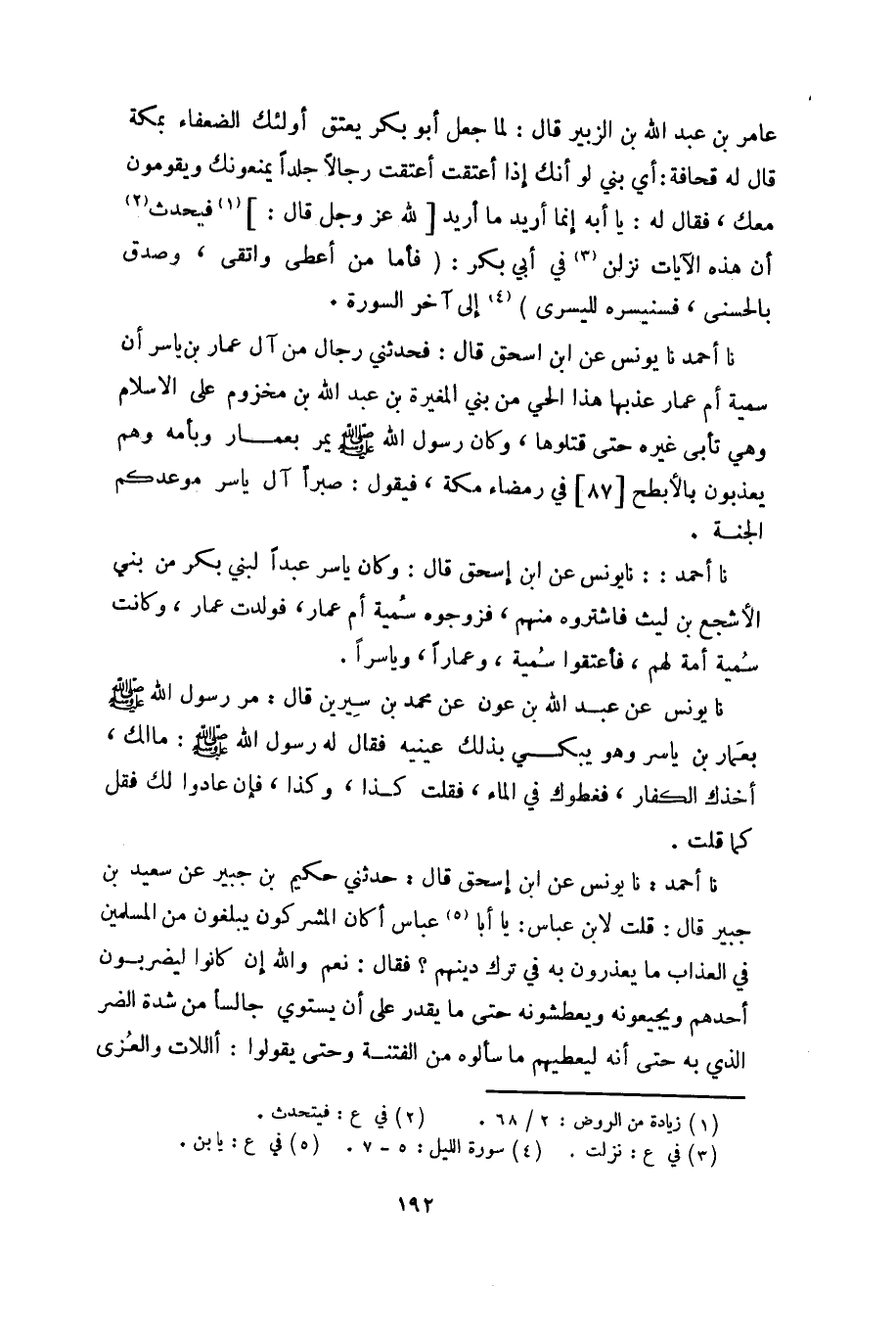 نا أحمد: نا يونس عن ابن إسحق قال: وكان ياسر عبداً لبني بكر من بني الأشجع بن ليث فاشتروه منهم، فزوجوه سمية أم عمار، فولدت عمار، وكانت سمية أمة لهم، فأعتقوا سمية، وعماراً، وياسراً.