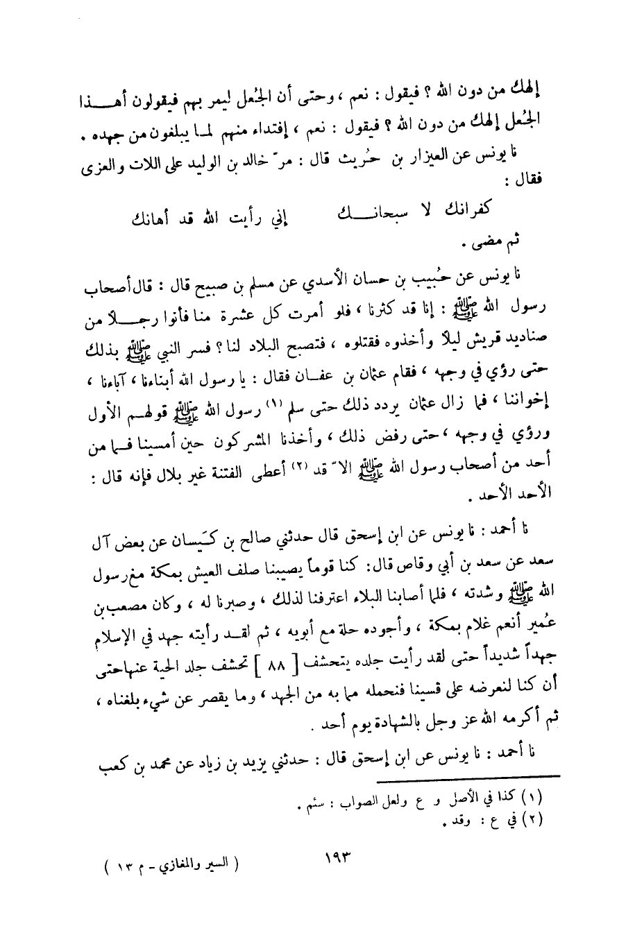 نا يونس عن حبيب بن حسان الأسدي عن مسلم بن صبيح قال: قال أصحاب رسول الله صلى الله عليه وسلم: أنا قد كثرنا، فلو أمرت كل عشرة منا فأتوا رجلاً من صناديد قريش ليلاً وأخذوه فقتلوه، فتصبح البلاد لنا؟ فسر النبي صلى الله عليه وسلم بذلك حتى رؤي في وجهه، فقام عثمان بن عفان فقال: يا رسول الله أبناءنا، آباءنا، إخواننا، فما زال عثمان يردد ذلك حتى سلم «1» رسول الله صلى الله عليه وسلم قولهم الأول ورؤي في وجهه، حتى رفض ذلك، وأخذنا المشركون حين أمسينا فما من أحد من أصحاب رسول الله صلى الله عليه وسلم الا قد «2» أعطى الفتنة غير بلال فإنه قال: