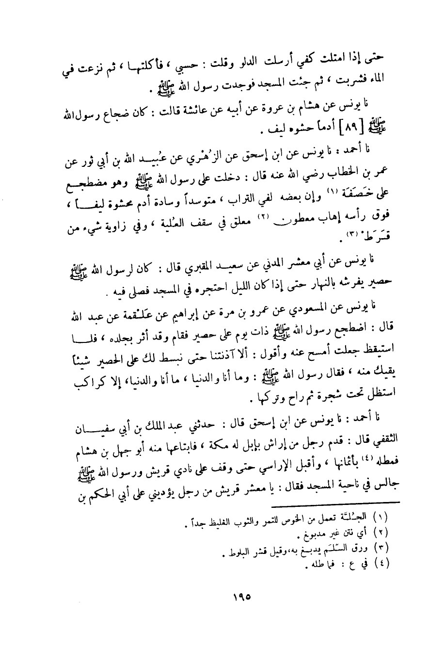 نا أحمد: نا يونس عن ابن اسحق عن الزهري عن عبيد الله بن أبي ثور عن عمر بن الخطاب رضي الله عنه قال: دخلت على رسول الله صلى الله عليه وسلم وهو مضطجع على خصفة «1» وإن بعضه لفي التراب، متوسداً وسادة أدم محشوة ليفاً، فوق رأسه إهاب معطون «2» معلق في سقف العلية، وفي زاوية شيء من قرط «3» .