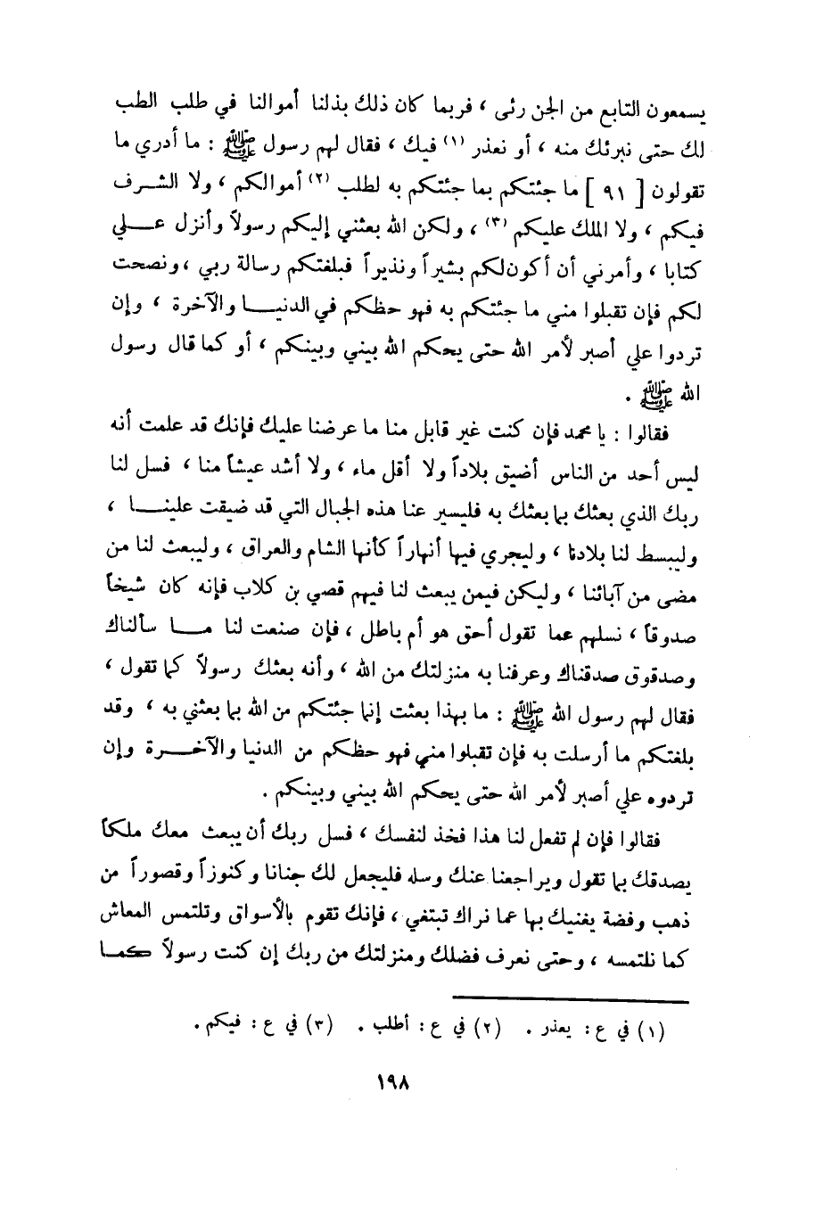 يسمون التابع من الجن رئى، فربما كان ذلك بذلنا أموالنا في طلب الطب لك حتى نبرئك منه، أو نعذر «1» فيك، فقال لهم رسول صلى الله عليه وسلم: ما أدري ما تقولون [91] ما جئتكم بما جئتكم به لطلب «2» أموالكم، ولا الشرف فيكم، ولا الملك عليكم «3» ، ولكن الله بعثني إليكم رسولاً وأنزل علي كتابا، وأمرني أن أكون لكم بشيراً ونذيراً فبلغتكم رسالة ربي، ونصحت لكم فإن تقبلوا مني ما جئتكم به فهو حظكم في الدنيا والآخرة، وإن تردوا علي أصبر لأمر الله حتى يحكم الله بيني وبينكم، أو كما قال رسول الله صلى الله عليه وسلم.