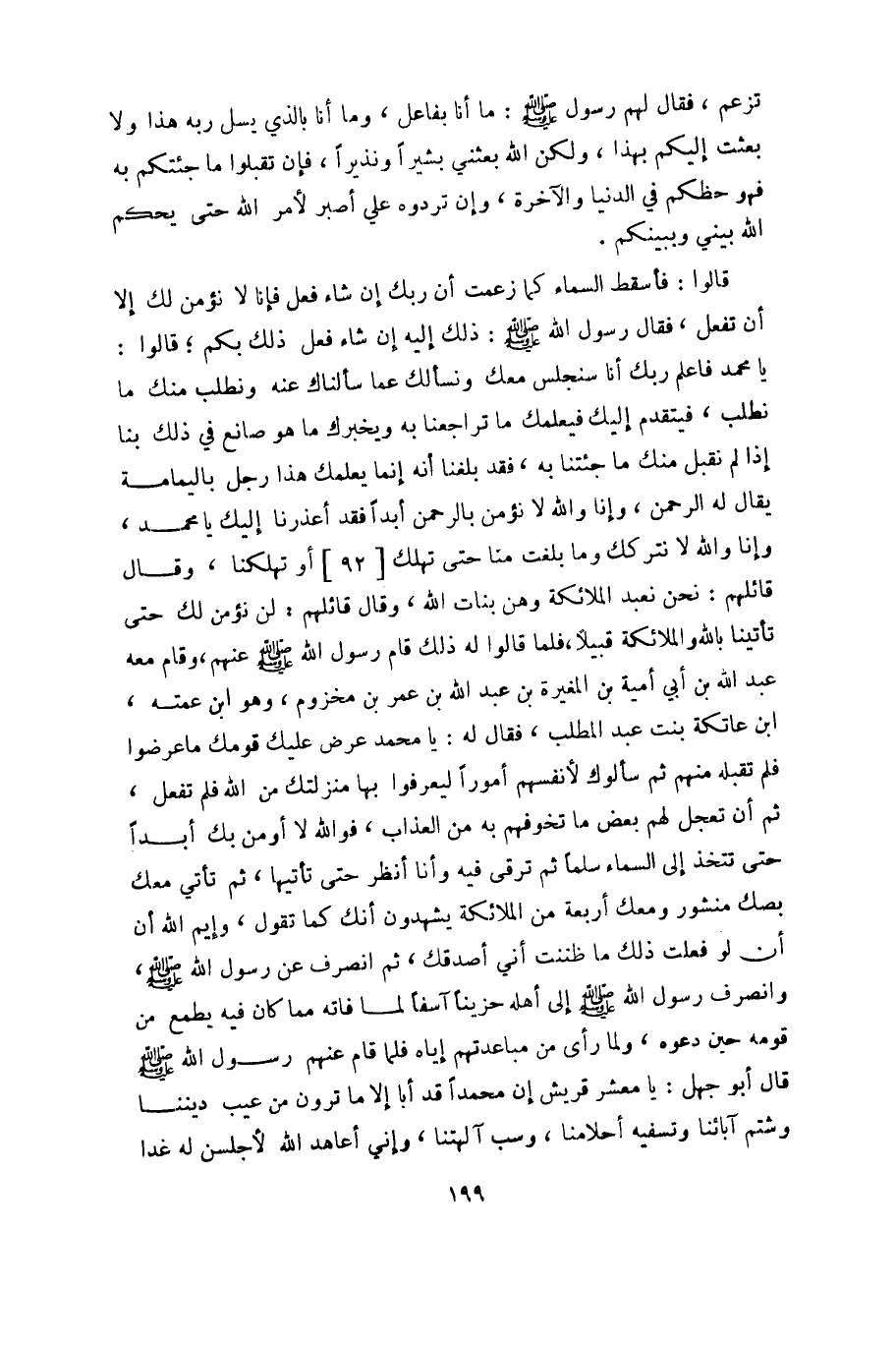 يا محمد فاعلم ربك أنا سنجلس معك ونسألك عما سألناك عنه ونطلب منك ما نطلب، فيتقدم إليك فيعلمك ما تراجعنا به ويخبرك ما هو صانع في ذلك بنا إذا لم نقبل منك ما جئتنا به، فقد بلغنا أنه إنما يعلمك هذا رجل باليمامة يقال له الرحمن، وإنا والله لا نؤمن بالرحمن أبداً فقد أعذرنا إليك يا محمد، وإنا والله لا نتركك وما بلغت منا حتى تهلك [92] أو تهلكنا، وقال قائلهم: نحن نعبد الملائكة وهن بنات الله، وقال قائلهم: لن نؤمن لك حتى تأتينا بالله والملائكة قبيلاً، فلما قالوا له ذلك قام رسول الله صلى الله عليه وسلم عنهم، وقام معه عبد الله بن أبي أمية بن المغيرة بن عبد الله بن عمر بن مخزوم، وهو ابن عمته، ابن عاتكة بنت عبد المطلب، فقال له: يا محمد عرض عليك قومك ما عرضوا فلم تقبله منهم ثم سألوك لأنفسهم أموراً ليعرفوا بها منزلتك من الله فلم تفعل، ثم أن تعجل لهم بعض ما تخوفهم به من العذاب، فو الله لا أومن بك أبداً حتى تتخذ إلى السماء سلماً ثم ترقى فيه وأنا أنظر حتى تأتيها، ثم تأتي معك بصك منشور ومعك أربعة من الملائكة يشهدون أنك كما تقول، وإيم الله أن أن لو فعلت ذلك ما ظننت أني أصدقك، ثم انصرف عن رسول الله صلى الله عليه وسلم، وانصرف رسول الله صلى الله عليه وسلم إلى أهله حزيناً آسفاً لما فاته مما كان فيه يطمع من قومه حين دعوه، ولما رأى من مباعدتهم إياه فلما قام عنهم رسول الله صلى الله عليه وسلم قال أبو جهل: يا معشر قريش إن محمدا قد أبى إلا ما ترون من عيب ديننا وشتم آبائنا وتسفيه أحلامنا، وسب آلهتنا، وإني أعاهد الله لأجلسن له غدا