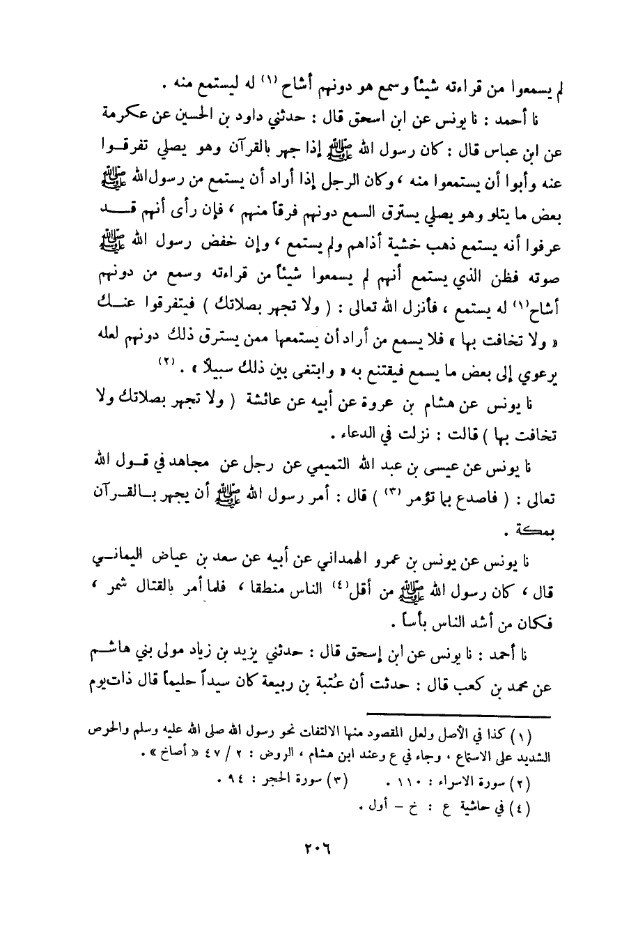نا أحمد: نا يونس عن ابن إسحق قال: حدثني داود بن الحسين عن عكرمة عن ابن عباس قال: كان رسول الله صلى الله عليه وسلم إذا جهر بالقرآن وهو يصلي تفرقوا عنه وأبوا أن يستمعوا منه، وكان الرجل إذا أراد أن يستمع من رسول الله صلى الله عليه وسلم بعض ما يتلو وهو يصلي يسترق السمع دونهم فرقاً منهم، فإن رأى أنهم قد عرفوا أنه يستمع ذهب خشية أذاهم ولم يستمع، وإن خفض رسول الله صلى الله عليه وسلم صوته فظن الذي يستمع أنهم لم يسمعوا شيئاً من قراءته وسمع من دونهم أشاح «2» له يستمع، فأنزل الله تعالى: (وَلا تَجْهَرْ بِصَلاتِكَ) فيتفرقوا عنك «وَلا تُخافِتْ بِها» فلا يسمع من أراد أن يستمعها ممن يسترق ذلك دونهم لعله يرعوي إلى بعض ما يسمع فيقتنع به «وَابْتَغِ بَيْنَ ذلِكَ سَبِيلًا» . «3»