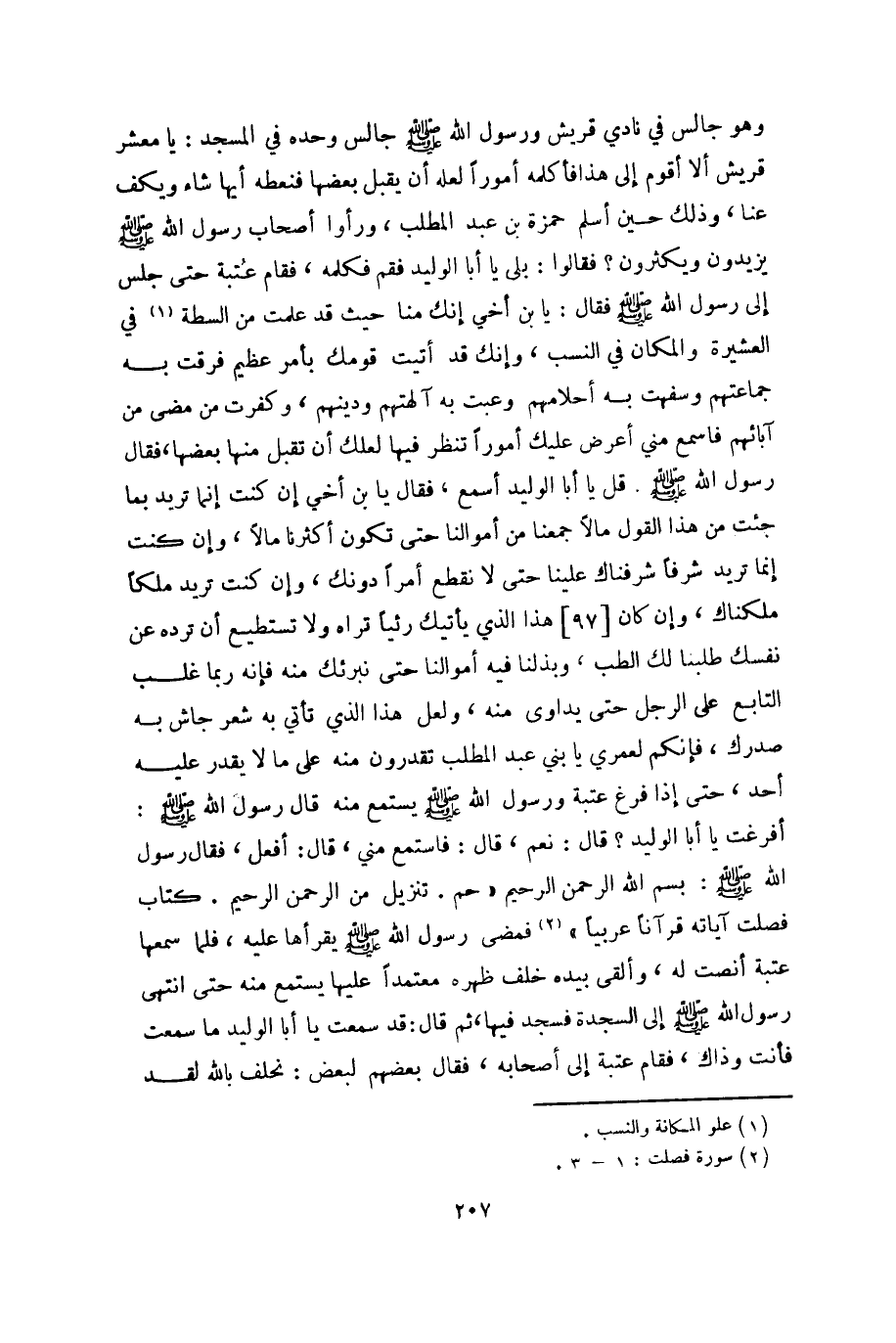 وهو جالس في نادي قريش ورسول الله صلى الله عليه وسلم جالس وحده في المسجد: يا معشر قريش ألا أقوم إلى هذا فأكلمه أموراً لعله أن يقبل بعضها فنعطه أيها شاء ويكف عنا، وذلك حين أسلم حمزة بن عبد المطلب، ورأوا أصحاب رسول الله صلى الله عليه وسلم يزيدون ويكثرون؟ فقالوا: بلى يا أبا الوليد فقم فكلمه، فقام عتبة حتى جلس إلى رسول الله صلى الله عليه وسلم فقال: يابن أخي إنك منا حيث قد علمت من السطة «1» في العشيرة والمكان في النسب، وإنك قد أتيت قومك بأمر عظيم فرقت به جماعتهم وسفهت به أحلامهم وعبت به آلهتهم ودينهم، وكفرت من مضى من آبائهم فاسمع مني أعرض عليك أموراً تنظر فيها لعلك أن تقبل منها بعضها، فقال رسول الله صلى الله عليه وسلم. قل يا أبا الوليد أسمع، فقال يابن أخي إن كنت إنما تريد بما جئت من هذا القول مالاً جمعنا من أموالنا حتى تكون أكثرنا مالاً، وإن كنت إنما تريد شرفاً شرفناك علينا حتى لا نقطع أمراً دونك، وإن كنت تريد ملكاً ملكناك، وإن كان [97] هذا الذي يأتيك رئياً تراه ولا تستطيع أن ترده عن نفسك طلبنا لك الطب، وبذلنا فيه أموالنا حتى نبرئك منه فإنه ربما غلب التابع على الرجل حتى يداوى منه، ولعل هذا الذي تأتي به شعر جاش به صدرك، فإنكم لعمري يا بني عبد المطلب تقدرون منه على ما لا يقدر عليه أحد، حتى إذا فرغ عتبة ورسول الله صلى الله عليه وسلم يستمع منه قال رسول الله صلى الله عليه وسلم:
