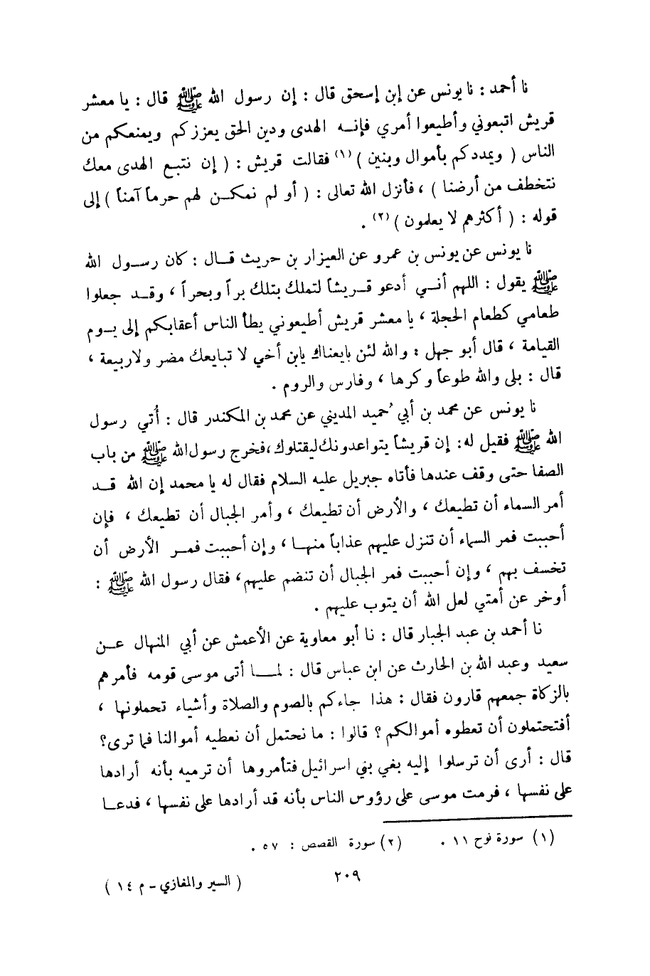 نا أحمد: نا يونس عن ابن إسحق قال: إن رسول الله صلى الله عليه وسلم قال: يا معشر قريش اتبعوني وأطيعوا أمري فإنه الهدى ودين الحق يعززكم ويمنعكم من الناس (وَيُمْدِدْكُمْ بِأَمْوالٍ وَبَنِينَ) «1» فقالت قريش: (إِنْ نَتَّبِعِ الْهُدى مَعَكَ نُتَخَطَّفْ مِنْ أَرْضِنا) ، فانزل الله تعالى: (أَوَلَمْ نُمَكِّنْ لَهُمْ حَرَماً آمِناً) إلى قوله: (أَكْثَرَهُمْ لا يَعْلَمُونَ) «2» .