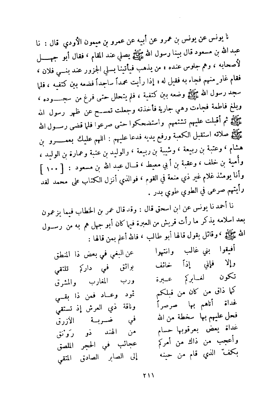 نا يونس عن يونس بن عمرو عن أبيه عن عمرو بن ميمون الأودي قال: نا عبد الله بن مسعود قال بينا رسول الله صلى الله عليه وسلم يصلي عند المقام، فقال أبو جهل لأصحابه، وهم جلوس عنده: من يذهب فيأتينا بسلي الجزور عند بني فلان، فقام غاو منهم فجاء به فقيل له: إذا رأيت محمداً ساجداً فضعه بين كتفيه، فلما سجد رسول الله صلى الله عليه وسلم وضعه بين كتفية، فلم يتحلل حتى فرغ من سجوده، وبلغ فاطمة فجاءت وهي جارية فأخذته وجعلت تمسح عن ظهر رسول الله صلى الله عليه وسلم ثم أقبلت عليهم تشتمهم واستضحكوا حتى صرعوا فلما قضى رسول الله صلى الله عليه وسلم صلاته استقبل الكعبة ورفع يديه فدعا عليهم: اللهم عليك بعمرو بن هشام، وعتبة بن ربيعة، وشيبة بن ربيعة، والوليد بن عتبة وعمارة بن الوليد، وأمية بن خلف، وعقبة بن أبي معيط، قال عبد الله بن مسعود: [100] وأنا يومئذ غلام غير ذي منعة في القوم، فو الذي أنزل الكتاب على محمد لقد رأيتهم صرعى في الطوي طوي بدر.