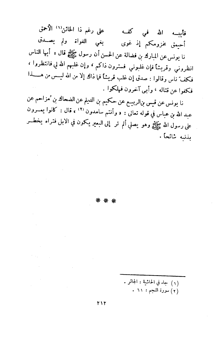 نا يونس عن قيس بن الربيع عن حكيم بن الديلم عن الضحاك بن مزاحم عن عبد الله بن عباس في قوله تعالى: «وَأَنْتُمْ سامِدُونَ «2» » قال: كانوا يمرون على رسول الله صلى الله عليه وسلم وهو يصلي ألم تر إلى البعير يكون في الابل فتراه يخطر بذنبه شائحا.