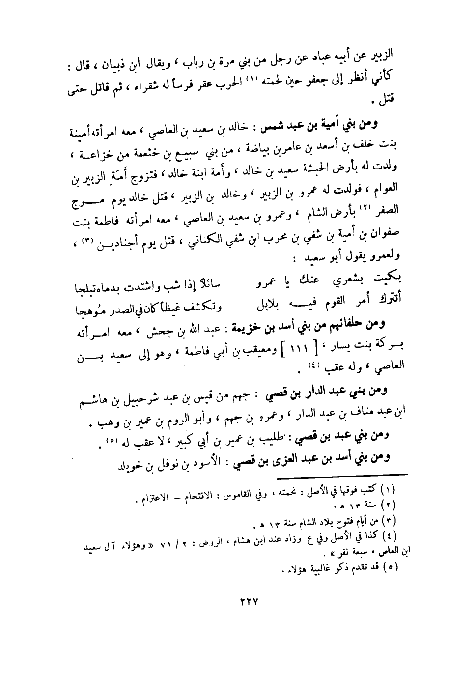 ومن بني أمية بن عبد شمس: خالد بن سعيد بن العاصي، معه امرأته أمينة بنت خلف بن أسعد بن عامر بن بياضة، من بني سبيع بن خثعمة من خزاعة، ولدت له بأرض الحبشة سعيد بن خالد، وأمه ابنة خالد، فتزوج أمة الزبير بن العوام، فولدت له عمرو بن الزبير، وخالد بن الزبير، قتل خالد يوم مرج الصفر «2» بأرض الشام، وعمرو بن سعيد بن العاصي، معه امرأته فاطمة بنت صفوان بن أمية بن شفي بن محرب ابن شفي الكناني، قتل يوم أجنادين «3» ، ولعمرو يقول أبو سعيد: