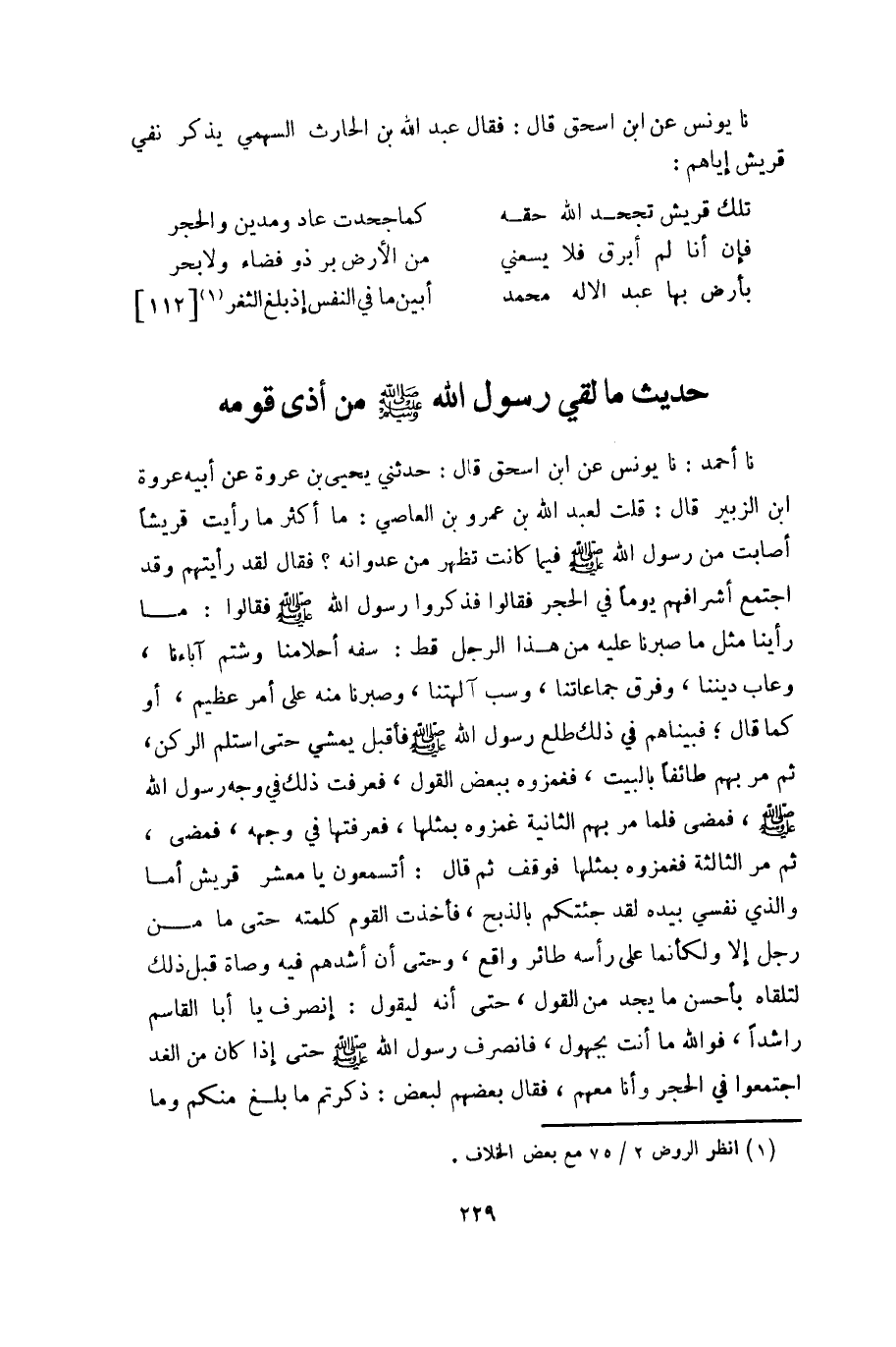 نا أحمد: نا يونس عن ابن إسحق قال: حدثني يحيى بن عروة عن أبيه عروة ابن الزبير قال: قلت لعبد الله بن عمرو بن العاصي: ما أكثر ما رأيت قريشاً أصابت من رسول الله صلى الله عليه وسلم فيما كانت تظهر من عدوانه؟ فقال لقد رأيتهم وقد اجتمع أشرافهم يوماً في الحجر فقالوا فذكروا رسول الله صلى الله عليه وسلم فقالوا: ما رأينا مثل ما صبرنا عليه من هذا الرجل قط: سفه أحلامنا وشتم آباءنا، وعاب ديننا، وفرق جماعاتنا، وسب آلهتنا، وصبرنا منه على أمر عظيم، أو كما قال؛ فبيناهم في ذلك طلع رسول الله صلى الله عليه وسلم فأقبل يمشي حتى استلم الركن، ثم مر بهم طائفاً بالبيت، فغمزوه ببعض القول، فعرفت ذلك في وجه رسول الله صلى الله عليه وسلم، فمضى فلما مر بهم الثانية غمزوه بمثلها، فعرفتها في وجهه، فمضى، ثم مر الثالثة فغمزوه بمثلها فوقف ثم قال: أتسمعون يا معشر قريش أما والذي نفسي بيده لقد جئتكم بالذبح، فأخذت القوم كلمته حتى ما من رجل إلا ولكأنما على رأسه طائر واقع، وحتى أن أشدهم فيه وصاة قبل ذلك لتلقاه بأحسن ما يجد من القول، حتى أنه ليقول: إنصرف يا أبا القاسم راشداً، فو الله ما أنت بجهول، فانصرف رسول الله صلى الله عليه وسلم حتى إذا كان من الغد اجتمعوا في الحجر وأنا معهم، فقال بعضهم لبعض: ذكرتم ما بلغ منكم وما