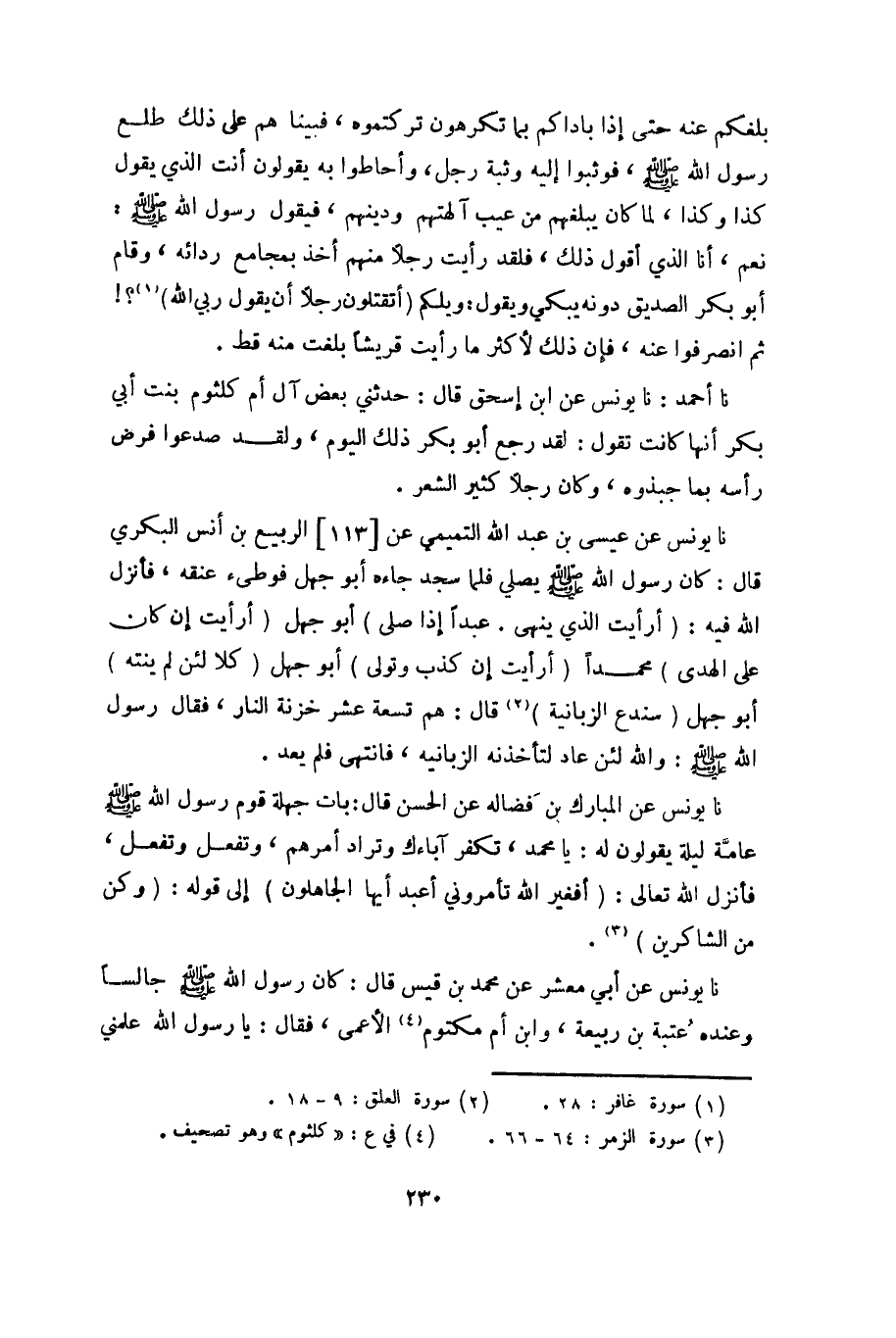 نا يونس عن عيسى بن عبد الله التميمي عن [113] الربيع بن أنس البكري قال: كان رسول الله صلى الله عليه وسلم يصلي فلما سجد جاءه أبو جهل فوطىء عنقه، فأنزل الله فيه: (أَرَأَيْتَ الَّذِي يَنْهى. عَبْداً إِذا صَلَّى) أبو جهل (أَرَأَيْتَ إِنْ كانَ عَلَى الْهُدى) محمداً (أَرَأَيْتَ إِنْ كَذَّبَ وَتَوَلَّى) أبو جهل (كَلَّا لَئِنْ لَمْ يَنْتَهِ) أبو جهل (سَنَدْعُ الزَّبانِيَةَ) «2» قال: هم تسعة عشر خزنة النار، فقال رسول الله صلى الله عليه وسلم: والله لئن عاد لتأخذنه الزبانية، فانتهى فلم يعد.