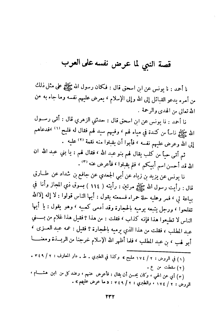 نا أحمد: نا يونس عن ابن إسحق قال: فكان رسول الله صلى الله عليه وسلّم على مثل ذلك من أمره يدعو القبائل إلى الله وإلى الإسلام، يعرض عليهم نفسه وما جاء به من الله تعالى من الهدى والرحمة.