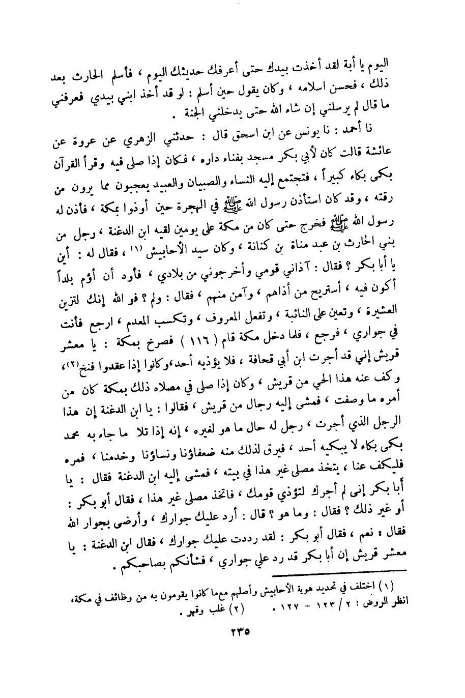 نا أحمد: نا يونس عن ابن إسحق قال: حدثني الزهري عن عروة عن عائشة قالت كان لأبي بكر مسجد بفناء داره، فكان إذا صلى فيه وقرأ القرآن بكى بكاء كبيرا، فتجتمع إليه النساء والصبيان والعبيد يعجبون مما يرون من رقته، وقد كان استأذن رسول الله صلى الله عليه وسلم في الهجرة حين أوذوا بمكة، فأذن له رسول الله صلى الله عليه وسلم فخرج حتى كان من مكة على يومين لقيه ابن الدغنة، رجل من بني الحارث بن عبد مناة بن كنانة، وكان سيد الأحابيش «1» ، فقال له: أين يا أبا بكر؟ فقال: آذاني قومي وأخرجوني من بلادي، فأود أن أؤم بلداً أكون فيه، أستريح من أذاهم، وآمن منهم، فقال: ولم؟ فو الله إنك لتزين العشيرة، وتعين على النائبة، وتفعل المعروف، وتكسب المعدم، ارجع فأنت في جواري، فرجع، فلما دخل مكة قام (116) فصرخ بمكة: يا معشر قريش إني قد أجرت ابن أبي قحافة، فلا يؤذيه أحد، وكانوا إذا عقدوا فنخ «2» ، وكف عنه هذا الحي من قريش، وكان إذا صلى في مصلاة ذلك بمكة كان من أمره ما وصفت، فمشى إليه رجال من قريش، فقالوا: يا ابن الدغنة إن هذا الرجل الذي أجرت، رجل له حال ما هو لغيره، إنه إذا تلا ما جاء به محمد بكى بكاء لا يبكيه أحد، فيرق لذلك منه ضعفاؤنا ونساؤنا وخدمنا، فمره فليكف عنا، يتخذ مصلى غير هذا في بيته، فمشى إليه ابن الدغنة فقال: يا أبا بكر إني لم أجرك لتؤذي قومك، فاتخذ مصلى غير هذا، فقال أبو بكر:
