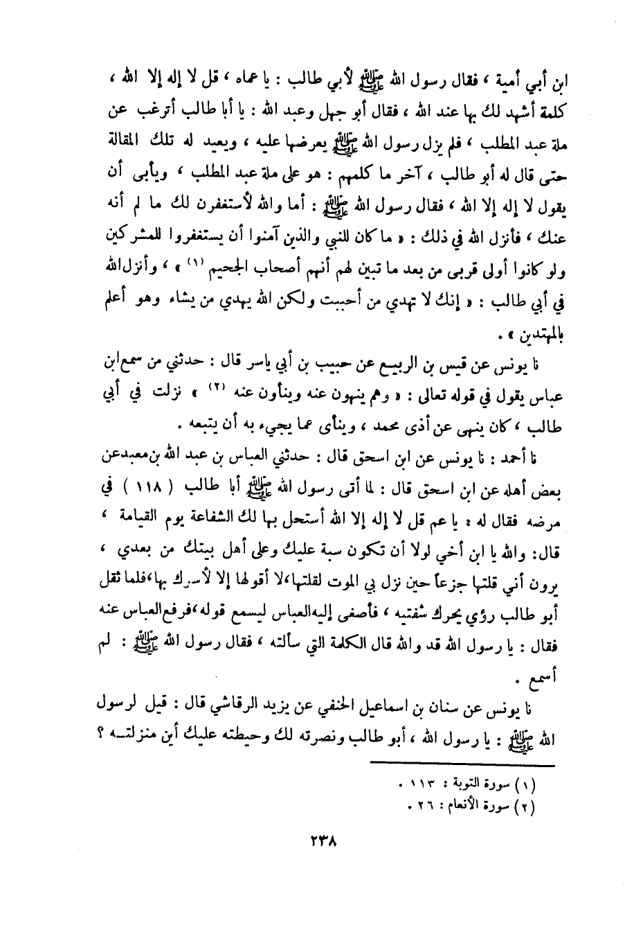 نا أحمد: نا يونس عن ابن إسحق قال: حدثني العباس بن عبد الله بن معبد عن بعض أهله عن ابن إسحق قال: لما أتى رسول الله صلى الله عليه وسلم أبا طالب (118) في مرضه فقال له: يا عم قل لا إله إلا الله أستحل بها لك الشفاعة يوم القيامة، قال: والله يا ابن أخي لولا أن تكون سبة عليك وعلى أهل بيتك من بعدي، يرون أني قلتها جزعاً حين نزل بي الموت لقلتها، لا أقولها إلا لأسرك بها، فلما ثقل أبو طالب رؤي يحرك شفتيه، فأصغى إليه العباس ليسمع قوله، فرفع العباس عنه فقال: يا رسول الله قد والله الكلمة التي سألته، فقال رسول الله صلى الله عليه وسلم: لم أسمع.