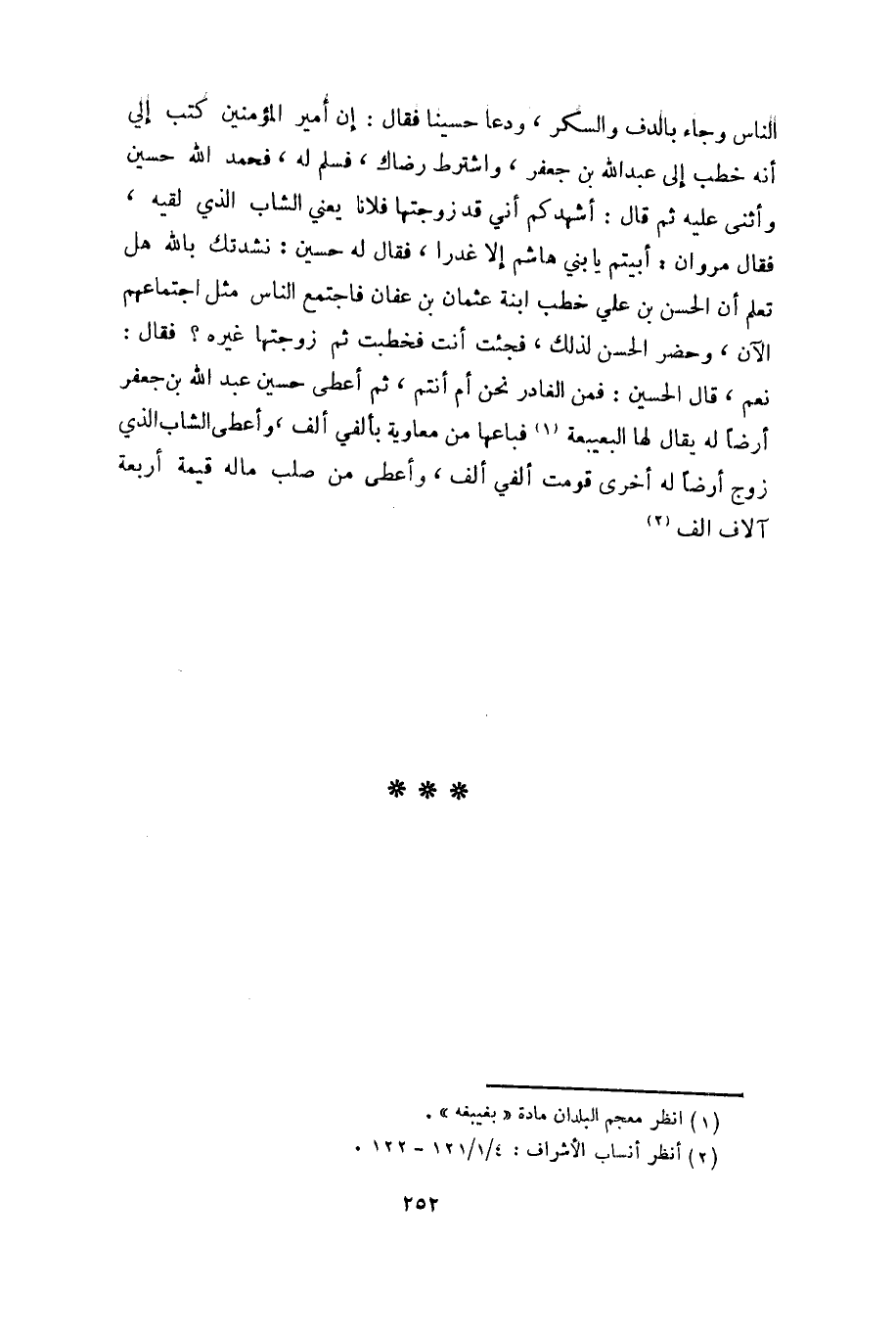 نعم، قال الحسين: فمن الغادر نحن أم أنتم، ثم أعطى حسين عبد الله بن جعفر أرضاً له يقال لها البغيبغة «1» فباعها من معاوية بألفي ألف، وأعطى الشاب الذي زوج أرضاً له أخرى قومت ألفي ألف، وأعطى من صلب ماله قيمة أربعة آلاف الف «2»