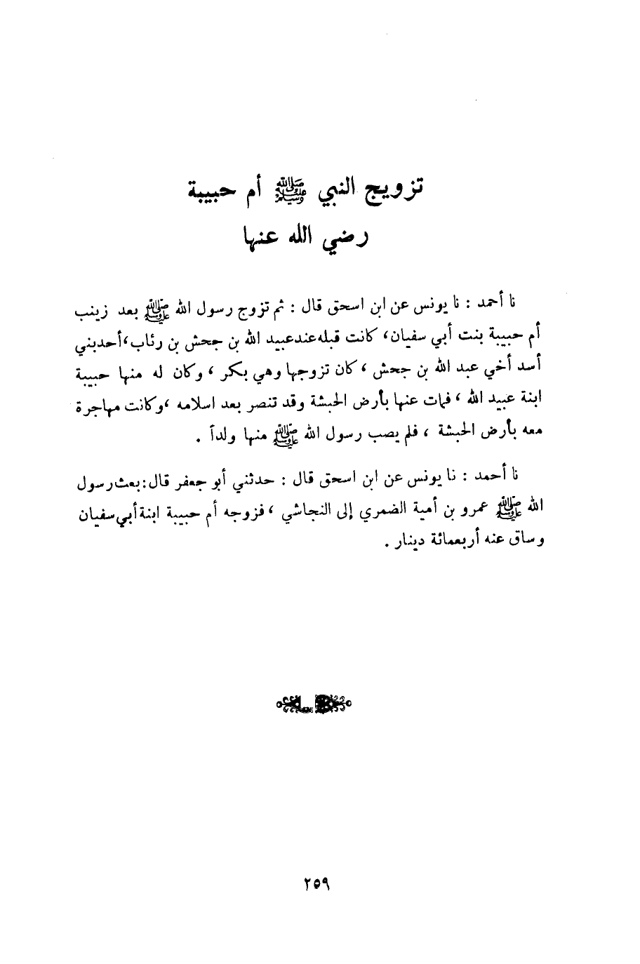 نا أحمد: نا يونس عن ابن إسحق قال: ثم تزوج رسول اللَّه صلى الله عليه وسلم بعد زينب أم حبيبة بنت أبي سفيان، كانت قبله عند عبيد اللَّه بن جحش بن رئاب، أحد بني أسد أخي عبد اللَّه بن جحش، كان تزوجها وهي بكر، وكان له منها حبيبة ابنة عبيد اللَّه، فمات عنها بأرض الحبشة وقد تنصر بعد اسلامه، وكانت مهاجرة معه بأرض الحبشة، فلم يصب رسول اللَّه صلى الله عليه وسلم منها ولداً.