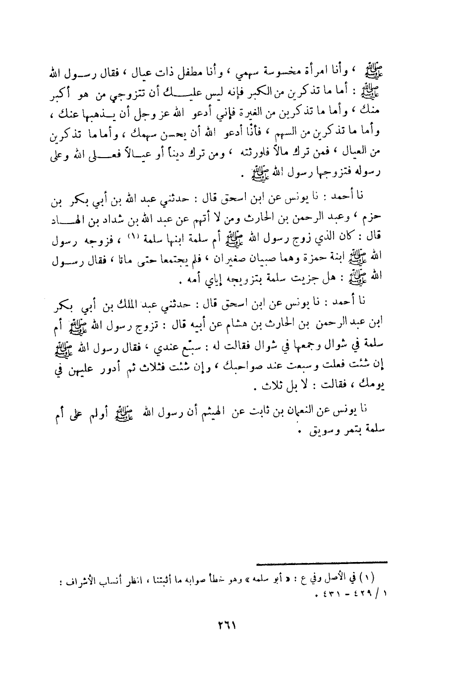 نا أحمد: نا يونس عن ابن إسحق قال: حدثني عبد اللَّه بن أبي بكر بن حزم، وعبد الرحمن بن الحارث ومن لا أتهم عن عبد اللَّه بن شداد بن الهاد قال: كان الذي زوج رسول اللَّه صلى الله عليه وسلم أم سلمة ابنها سلمة «1» ، فزوجه رسول اللَّه صلى الله عليه وسلم ابنة حمزة وهما صبيان صغيران، فلم يجتمعا حتى ماتا، فقال رسول اللَّه صلى الله عليه وسلم: هل جزيت سلمة بتزويجه إياي أمه.