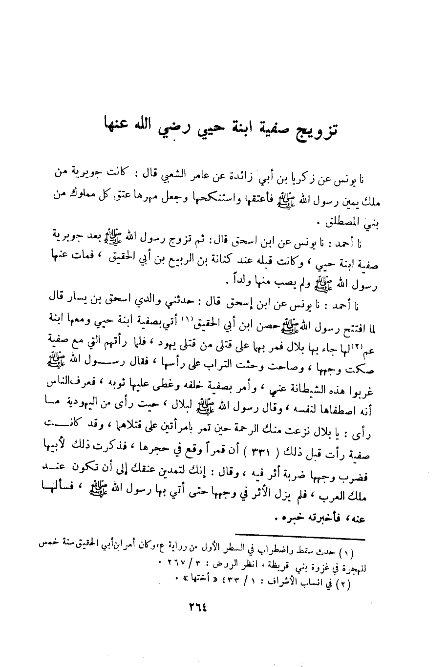 نا أحمد: نا يونس عن ابن إسحق قال: ثم تزوج رسول الله صلى الله عليه وسلم بعد جويرية صفية ابنة حيي، وكانت قبله عند كنانة بن الربيع بن أبي الحقيق، فمات عنها رسول اللَّه صلى الله عليه وسلم ولم يصب منها ولداً.
