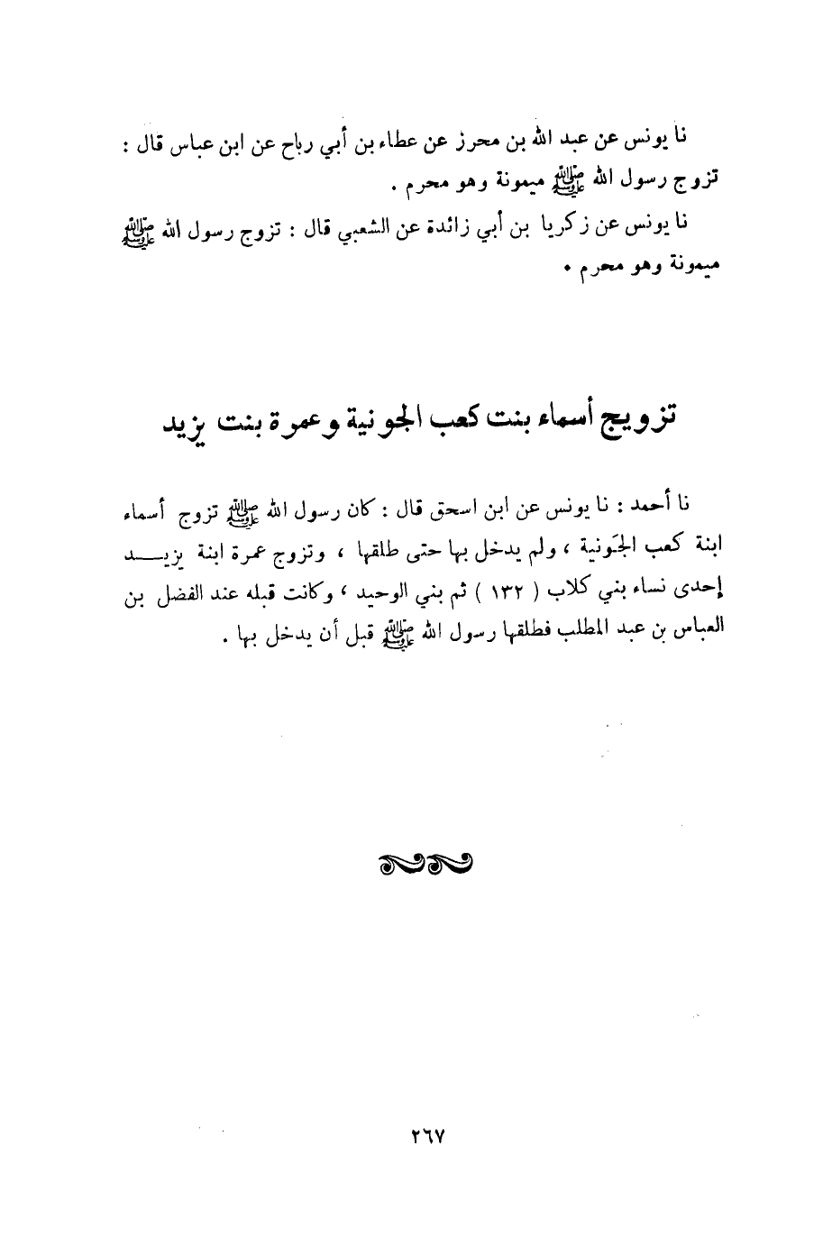 نا أحمد: نا يونس عن ابن اسحق قال: كان رسول اللَّه صلى الله عليه وسلم تزوج أسماء ابنة كعب الجونية، ولم يدخل بها حتى طلقها، وتزوج عمرة ابنة يزيد إحدى نساء بني كلاب (132) ثم بني الوحيد، وكانت قبله عند الفضل بن العباس بن عبد المطلب فطلقها رسول اللَّه صلى الله عليه وسلم قبل أن يدخل بها.