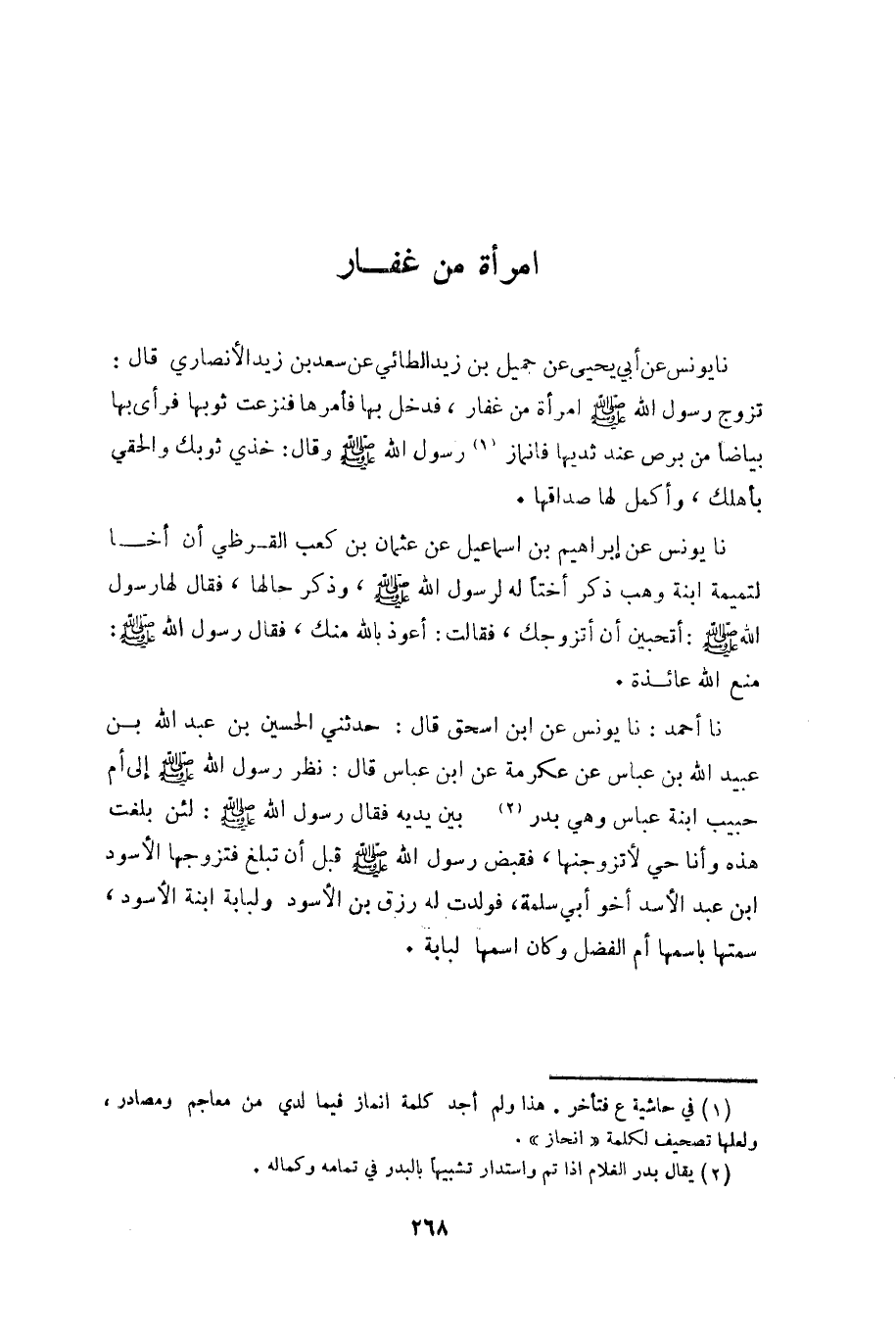 نا يونس عن إبراهيم بن اسماعيل عن عثمان بن كعب القرظي أن أخا لتميمة ابنة وهب ذكر أختاً له لرسول اللَّه صلى الله عليه وسلم، وذكر حالها، فقال لها رسول الله صلى الله عليه وسلم: أتحبين أن أتزوجك، فقالت: أعوذ بالله منك، فقال رسول الله صلى الله عليه وسلم: