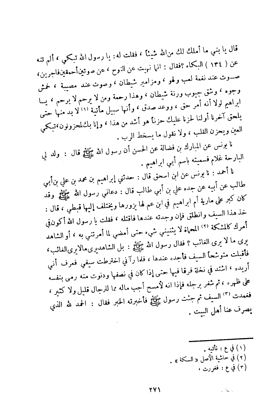 قال يا بني ما أملك لك من الله شيئاً، فقلت له: يا رسول الله تبكي، ألم تنه عن (134) البكاء؟ فقال: إنما نهيت عن النوح، عن صوتين أحمقين فاجرين، صوت عند نغمة لعب ولهو، ومزامير شيطان، وصوت عند مصيبة، خمش وجوه، وشق جيوب ورنة شيطان، وهذا رحمة ومن لا يرحم لا يرحم، يا ابراهيم لولا أنه أمر حق، ووعد صدق، وأنها سبيل مأتية «1» لا بد منها حتى يلحق آخرنا أولنا لحزنا عليك حزناً هو أشد من هذا، وإنا بك لمحزونون، تبكي العين ويحزن القلب، ولا نقول ما يسخط الرب.