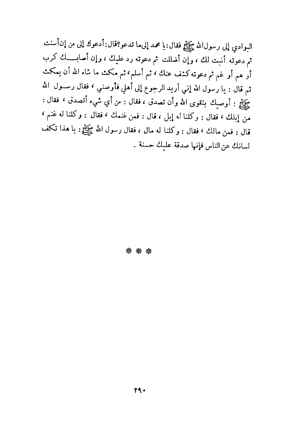 البوادي إلى رسول الله صلى الله عليه وسلم فقال: يا محمد إلى ما تدعو؟ قال: أدعوك إلى من إن أسنت ثم دعوته أنبت لك، وإن أضللت ثم دعوته رد عليك، وإن أصابك كرب أو هم أو غم ثم دعوته كشف عنك، ثم أسلم، ثم مكث ما شاء الله أن يمكث ثم قال: يا رسول الله إني أريد الرجوع إلى أهلي فأوصني، فقال رسول الله صلى الله عليه وسلم: أوصيك بتقوى الله وأن تصدق، فقال: من أي شيء أتصدق، فقال: