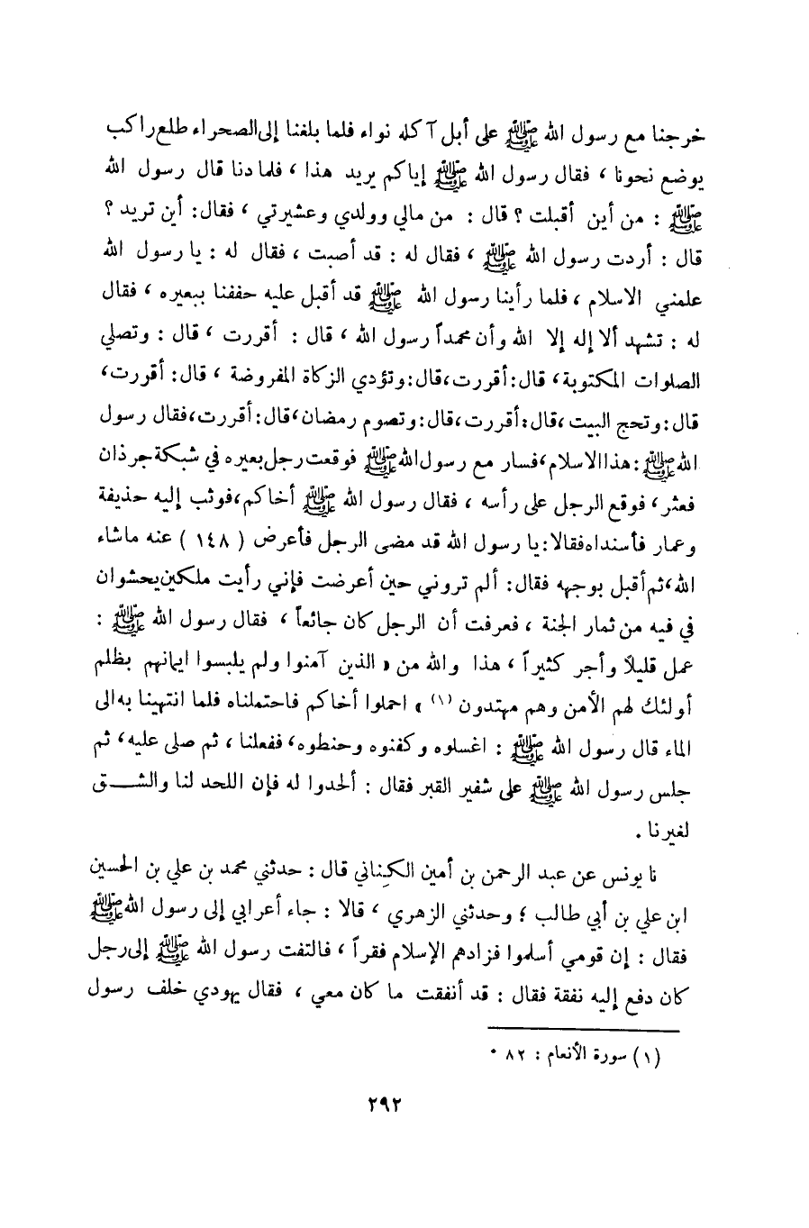قال: أردت رسول الله صلى الله عليه وسلم، فقال له: قد أصبت، فقال له: يا رسول الله علمني الاسلام، فلما رأينا رسول الله صلى الله عليه وسلم قد أقبل عليه حففنا ببعيره، فقال له: تشهد ألا إله إلا الله وأن محمدا رسول الله، قال: أقررت، قال: وتصلي الصلوات المكتوبة، قال: أقررت، قال: وتؤدي الزكاة المفروضة، قال: أقررت، قال: وتحج البيت، قال: أقررت، قال: وتصوم رمضان، قال: أقررت، فقال رسول الله صلى الله عليه وسلم: هذا الاسلام، فسار مع رسول الله صلى الله عليه وسلم فوقعت رجل بعيره في شبكة جرذان فعثر، فوقع الرجل على رأسه، فقال رسول الله صلى الله عليه وسلم أخاكم، فوثب إليه حذيفة وعمار فأسنداه فقالا: يا رسول الله قد مضى الرجل فأعرض (148) عنه ما شاء الله، ثم أقبل بوجهه فقال: ألم تروني حين أعرضت فإني رأيت ملكين يحشوان في فيه من ثمار الجنة، فعرفت أن الرجل كان جائعاً، فقال رسول الله صلى الله عليه وسلم: