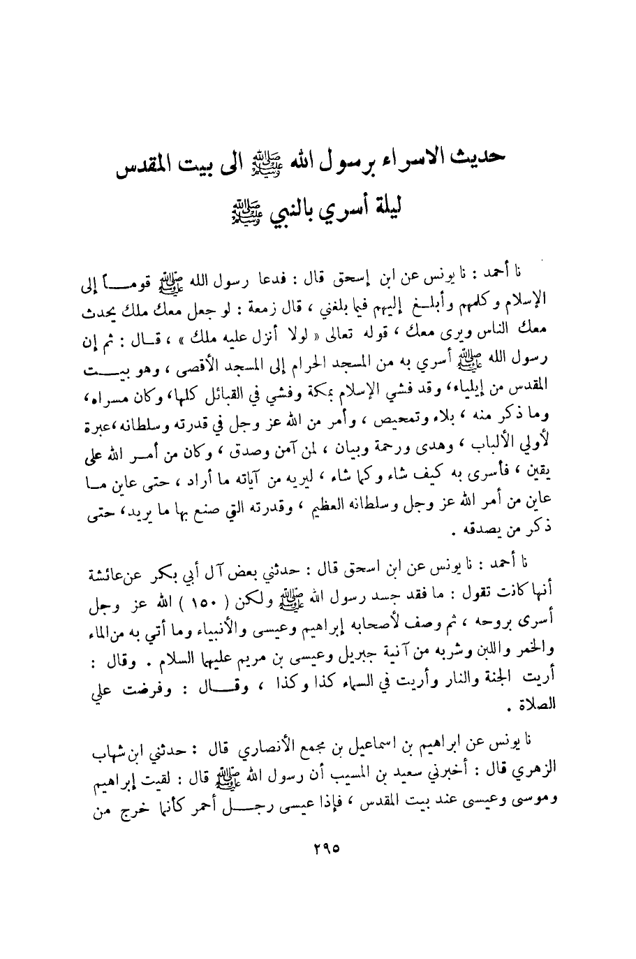 نا أحمد: نا يونس عن ابن إسحق قال: فدعا رسول الله صلى الله عليه وسلم قوماً إلى الإسلام وكلمهم وأبلغ إليهم فيما بلغني، قال زمعة: لو جعل معك ملك يحدث معك الناس ويرى معك، قوله تعالى «لَوْلا أُنْزِلَ عَلَيْهِ مَلَكٌ» ، قال: ثم إن رسول الله صلى الله عليه وسلم أسري به من المسجد الحرام إلى المسجد الأقصى، وهو بيت المقدس من إيلياء، وقد فشي الإسلام بمكة وفشي في القبائل كلها، وكان مسراه، وما ذكر منه، بلاء وتمحيص، وأمر من الله عز وجل في قدرته وسلطانه، عبرة لأولي الألباب، وهدى ورحمة وبيان، لمن آمن وصدق، وكان من أمر الله على يقين، فأسرى به كيف شاء وكما شاء، ليريه من آياته ما أراد، حتى عاين ما عاين من أمر الله عز وجل وسلطانه العظيم، وقدرته التي صنع بها ما يريد، حتى ذكر من يصدقه.