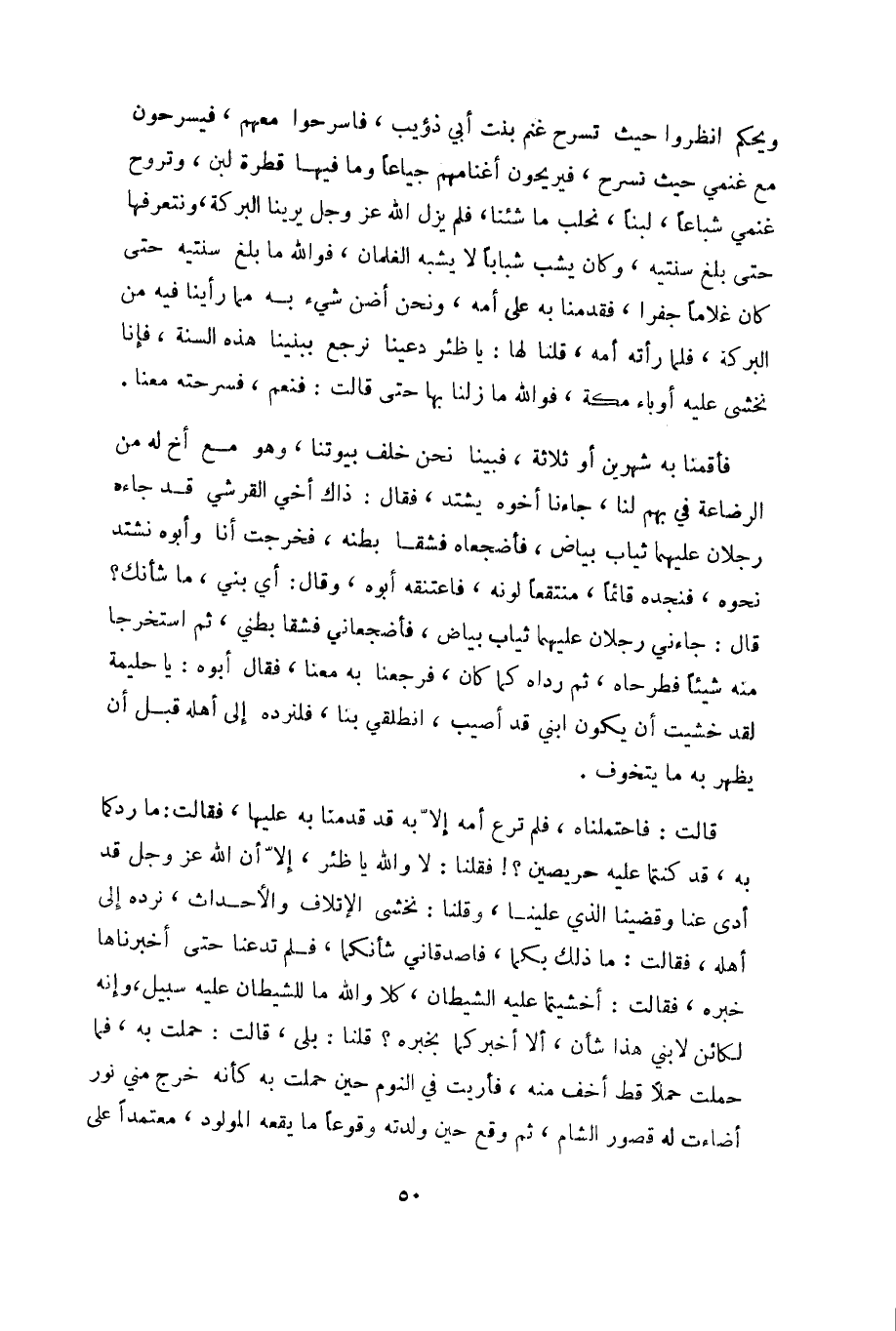 ويحكم انظروا حيث تسرح غنم بنت أبي ذؤيب، فاسرحوا معهم، فيسرحون مع غنمي حيث تسرح، فيريحون أغنامهم جياعاً وما فيها قطرة لبن، وتروح غنمي شباعاً، لبناً، نحلب ما شئنا، فلم يزل الله عز وجل يرينا البركة، ونتعرفها حتى بلغ سنتيه، وكان يشب شباباً لا يشبه الغلمان، فو الله ما بلغ سنتيه حتى كان غلاما جفرا، فقدمها به على أمه، ونحن أضن شيء به مما رأينا فيه من البركة