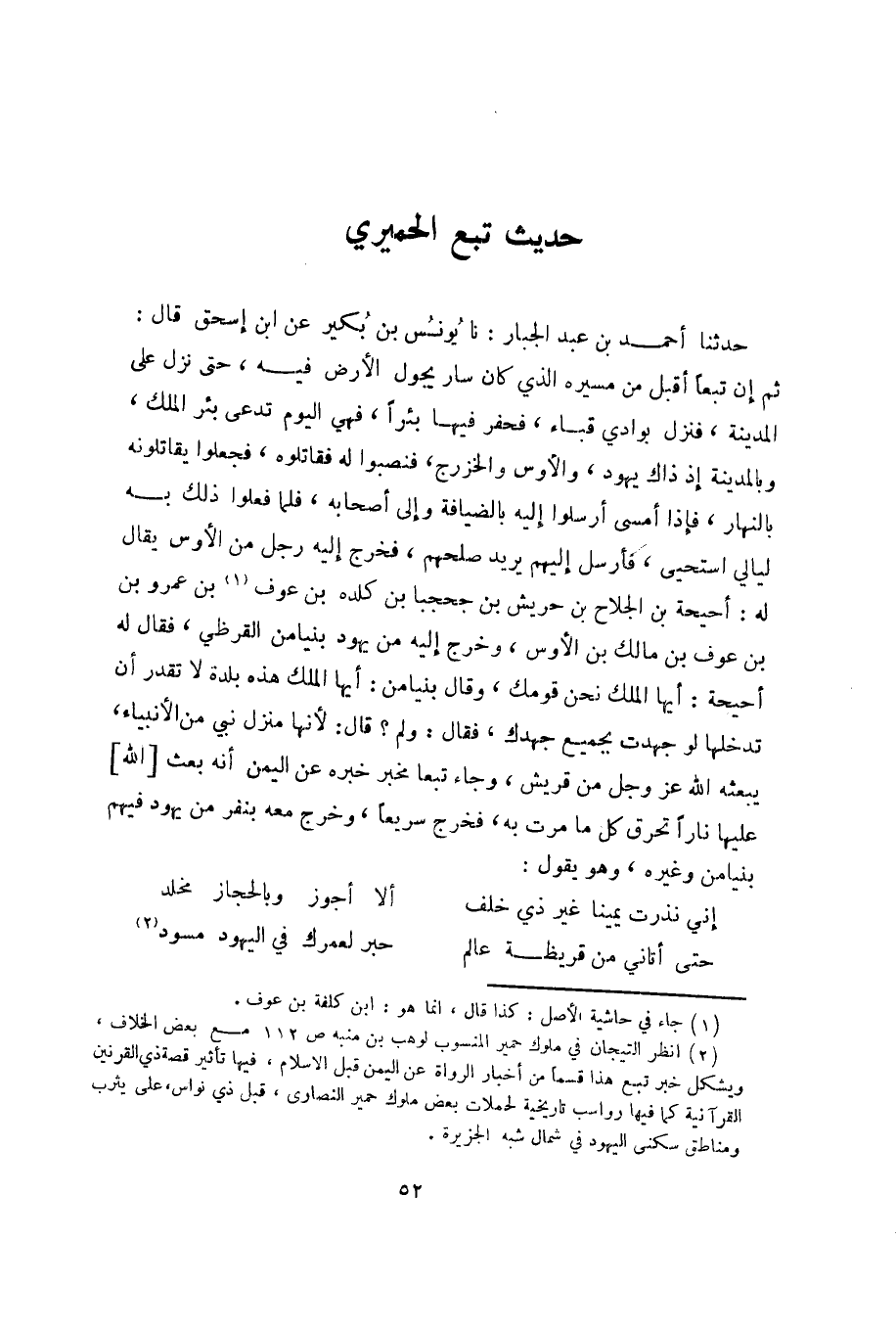 (2) انظر التيجان في ملوك حمير المنسوب لوهب بن منبه ص 112 مع بعض الخلاف، ويشكل خبر تبع هذا قسما من أخبار الرواة عن اليمن قبل الاسلام، فيها تأثير قصة ذي القرنين القرآنية كما فيها رواسب تاريخية لحملات بعض ملوك حمير النصارى، قبل ذي نواس، على يثرب ومناطق سكنى اليهود في شمال شبه الجزيرة.