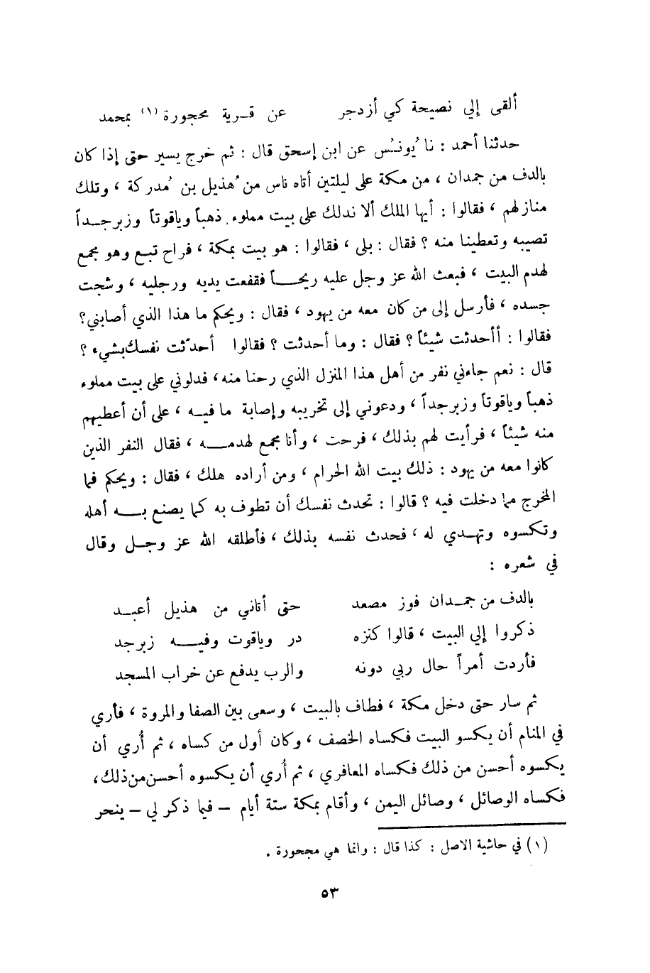 حدثنا أحمد: نا يونس عن ابن إسحق قال: ثم خرج يسير حتى إذا كان بالدف من جمدان، من مكة على ليلتين أتاه ناس من هذيل بن مدركة، وتلك منازلهم، فقالوا: أيها الملك ألا ندلك على بيت مملوء ذهباً وياقوتاً وزبرجداً تصيبه وتعطينا منه؟ فقال: بلى، فقالوا: هو بيت بمكة، فراح تبع وهو مجمع لهدم البيت، فبعث الله عز وجل عليه ريحاً فقفعت يديه ورجليه، وشجت جسده، فأرسل إلى من كان معه من يهود، فقال: ويحكم ما هذا الذي أصابني؟
