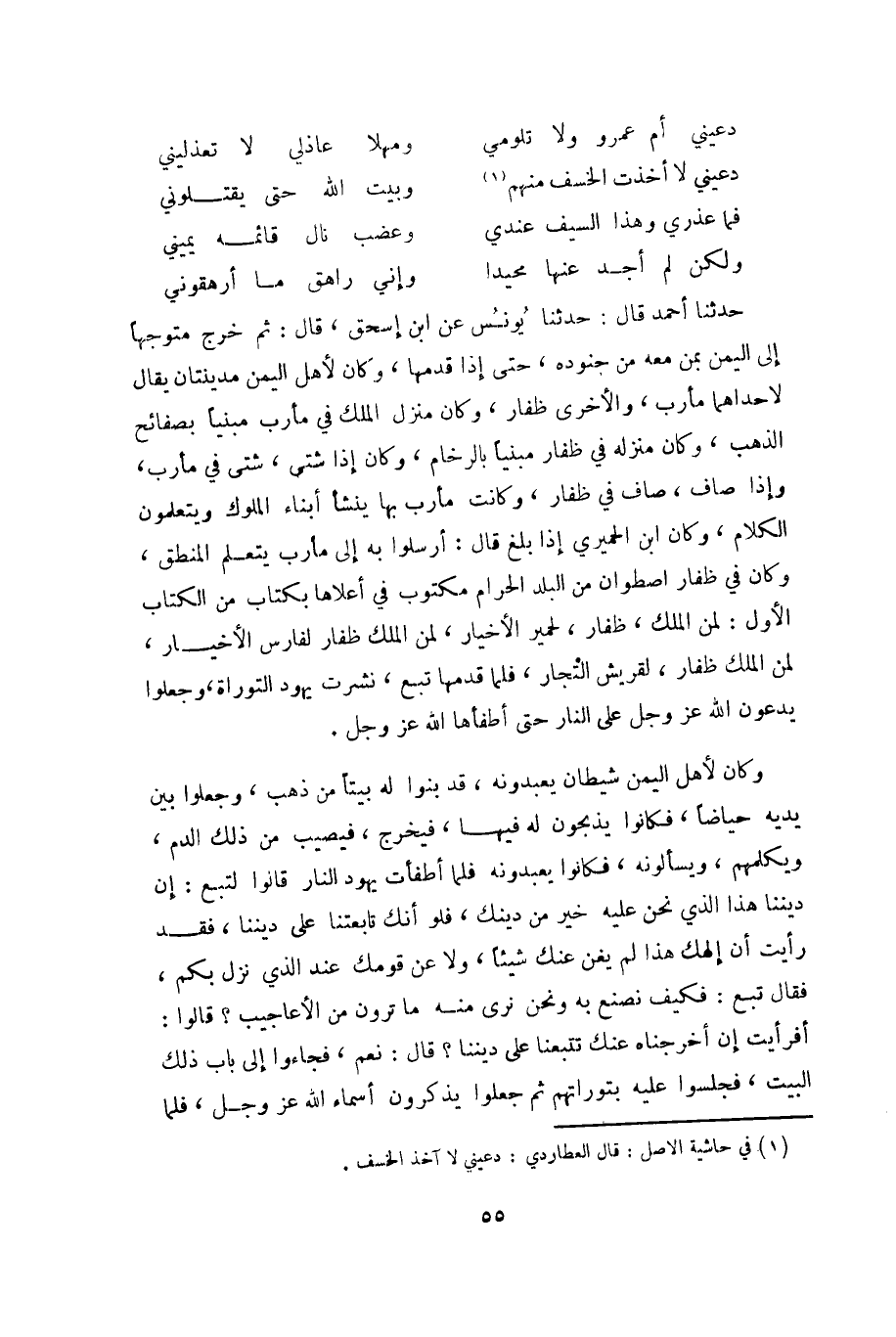 حدثنا أحمد قال: حدثنا يونس عن ابن إسحق، قال: ثم خرج متوجهاً إلى اليمن بمن معه من جنوده، حتى إذا قدمها، وكان لأهل اليمن مدينتان يقال لاحداهما مأرب، والأخرى ظفار، وكان منزل الملك في مأرب مبنياً بصفائح الذهب، وكان منزله في ظفار مبنياً بالرخام، وكان إذا شتى، شتى في مأرب، وإذا صاف، صاف في ظفار، وكانت مأرب بها ينشأ أبناء الملوك ويتعلمون الكلام، وكان ابن الحميري إذا بلغ قال: أرسلوا به إلى مأرب يتعلم المنطق، وكان في ظفار اصطوان من البلد الحرام مكتوب في أعلاها بكتاب من الكتاب الأول: لمن الملك، ظفار، لحمير الأخيار، لمن الملك ظفار لفارس الأخيار، لمن الملك ظفار، لقريش التجار، فلما قدمها تبع، نشرت يهود التوراة، وجعلوا يدعون الله عز وجل على النار حتى أطفأها الله عز وجل.