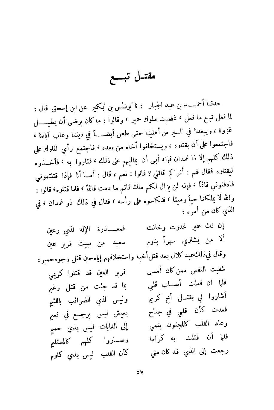 لما فعل تبع ما فعل، غضبت ملوك حمير، وقالوا: ما كان يرضى أن يطيل غزونا، ويبعدنا في المسير من أهلينا حتى طعن أيضاً في ديننا وعاب آباءنا، فاجتمعوا على أن يقتلوه، ويستخلفوا أخاه من بعده، فاجتمع رأي الملوك على ذلك كلهم إلا ذا غمدان فإنه أبى أن يماليهم على ذلك، فثاروا به، فأخذوه ليقتلوه فقال لهم: أتراكم قاتلي؟ قالوا: نعم، قال: اما أنا فإذا قتلتموني فادفنوني قائماً، فإنه لن يزال لكم ملك قائم ما دمت قائماً، فلما قتلوه، قالوا: