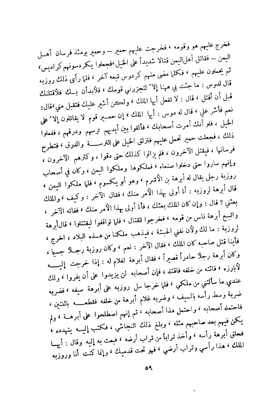 نعم فأشر علي، قال له دوس: أيها الملك، إن حمير قوم لا يقاتلون إلا على الخيل، فلو أنك أمرت أصحابك، فألقوا بين أيديهم ترسهم ودرقهم، ففعلوا ذلك، فجعلت حمير تحمل عليهم فتزلق الخيل على الترسة والدرق، فتطرح فرسانها، فيقتل الآخرون، فلم يزالوا كذلك حتى دقوا، وكثرهم الآخرون، وإنهم ساروا حتى دخلوا صنعاء، فملكوها وملكوا اليمن، وكان في اصحاب روزبة رجل يقال له أبرهة بن الأشرم، وهو أبو يكسوم، فلما ملكوا اليمن، قال أبرهة لروزبة: أنا أولى بهذا الأمر منك، فقال الآخر: وكيف، والملك بعثني؟ قال: وإن كان الملك بعثك، فأنا أولى بهذا الأمر منك، ففاته الآخر، واتبع أبرهة ناس من قومه، فخرجوا للقتال، فلما تواقفوا ليقتتلوا، قال أبرهة لروزبة: ما لك ولأن نفني الحبشة، فيذهب ملكنا من هذه البلاد، اخرج، فأينا قتل صاحبه كان الملك، فقال الآخر: نعم، وكان روزبة رجلاً جسيما، وكان أبرهة رجلاً حادراً قصيراً، فقال أبرهة لغلام له: إذا خرجت إليه لأبارزه، فائته من خلفه فاقتله، فإن أصحابه لن يزيدوا على أن يفروا، ولك عندي ما سألتني من ملكي، فلما خرجا سل روزبه على أبرهة سيفه، فضربه ضربة وسط رأسه بالسيف، وضربه غلام أبرهة من خلفه فقطعه باثنتين، فاحتمله أصحابه، واحتمل هذا أصحابه، ثم إنهم اصطلحوا على أبرهة، ولم يكن فيهم بعد صاحبهم مثله، وبلغ ذلك النجاشي، فكتب إليه يتهدده، فحلق أبرهة رأسه، وأخذ تراباً من تراب أرضه، فبعث به إليه وقال: أيها الملك، هذا رأسي وتراب أرضي، فهو تحت قدميك، وإنما كنت أنا وروزبه