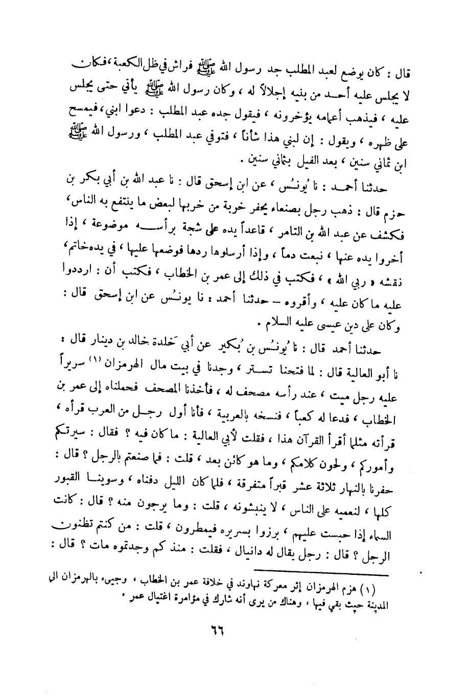 نا أبو العالية قال: لما فتحنا تستر، وجدنا في بيت مال الهرمزان «1» سريراً عليه رجل ميت، عند رأسه مصحف له، فأخذنا المصحف فحملناه إلى عمر بن الخطاب، فدعا له كعباً، فنسخه بالعربية، فأنا أول رجل من العرب قرأه، قرأته مثلما أقرأ القرآن هذا، فقلت لأبي العالية: ما كان فيه؟ فقال: سيرتكم وأموركم، ولحون كلامكم، وما هو كائن بعد، قلت: فما صنعتم بالرجل؟ قال: