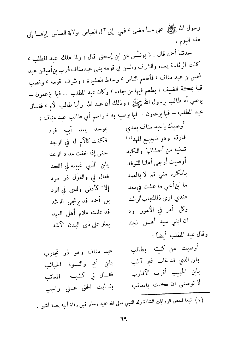 حدثنا أحمد قال: نا يونس عن ابن إسحق قال: ولما هلك عبد المطلب، كانت الرئاسة بعده والشرف والسن في قومه بني عبد مناف لحرب بن أمية بن عبد شمس بن عبد مناف، فأطعم الناس، وحاط العشيرة، وشرف قومه، ونصب قبة بمكة للضيف، يطعم فيها من جاءه، وكان عبد المطلب- فيما يزعمون- يوصي أبا طالب برسول الله صلى الله عليه وسلم، وذلك أن عبد الله وأبا طالب لأم، فقال عبد المطلب- فيما يزعمون- فيما يوصيه به، واسم أبي طالب عبد مناف: