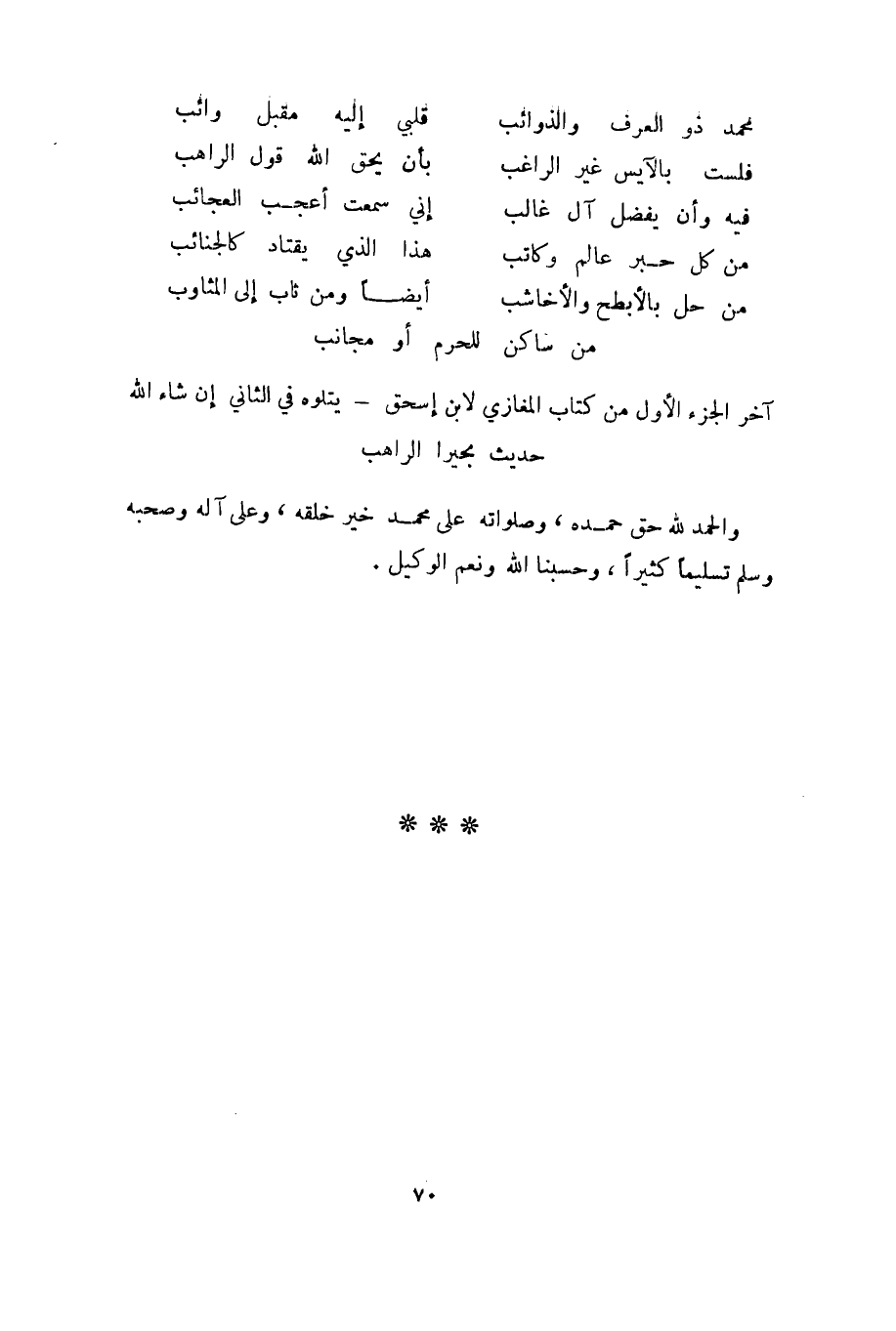 آخر الجزء الأول من كتاب المغازي لابن إسحق- يتلوه في الثاني إن شاء الله حديث بحيرا الراهب والحمد لله حق حمده، وصلواته على محمد خير خلقه، وعلى آله وصحبه وسلم تسليما كثيراً، وحسبنا الله ونعم الوكيل.