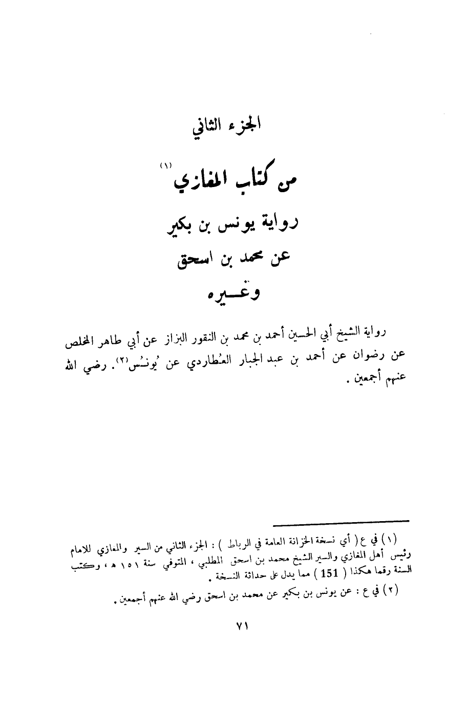 (1) في ع (أي نسخة الخزانة العامة في الرباط) : الجزء الثاني من السير والمغازي للامام رئيس أهل المغازي والسير الشيخ محمد بن إسحق المطلبي، المتوفى سنة 151 هـ، وكتب السنة رقما هكذا (151) مما يدل على حداثة النسخة.