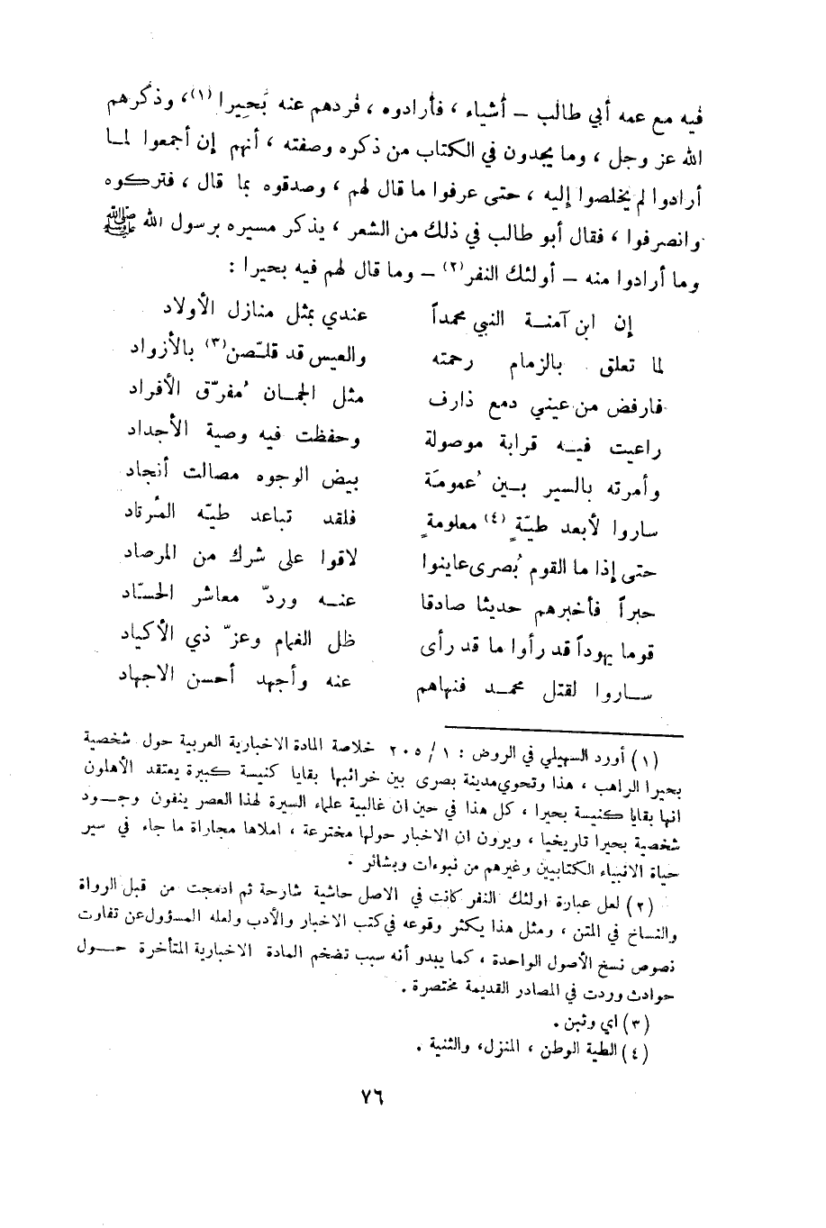 (1) أورد السهيلي في الروض: 1/ 205 خلاصة المادة الاخبارية العربية حول شخصية بحيرا الراهب، هذا وتحوي مدينة بصرى بين خرائبها بقايا كنيسة كبيرة يعتقد الأهلون انها بقايا كنيسة بحيرا، كل هذا في حين ان غالبية علماء السيرة لهذا العصر ينفون وجود شخصية بحيرا تاريخيا، ويرون ان الاخبار حولها مخترعة، املاها مجاراة ما جاء في سير حياة الانبياء الكتابيين وغيرهم من نبوءات وبشائر.