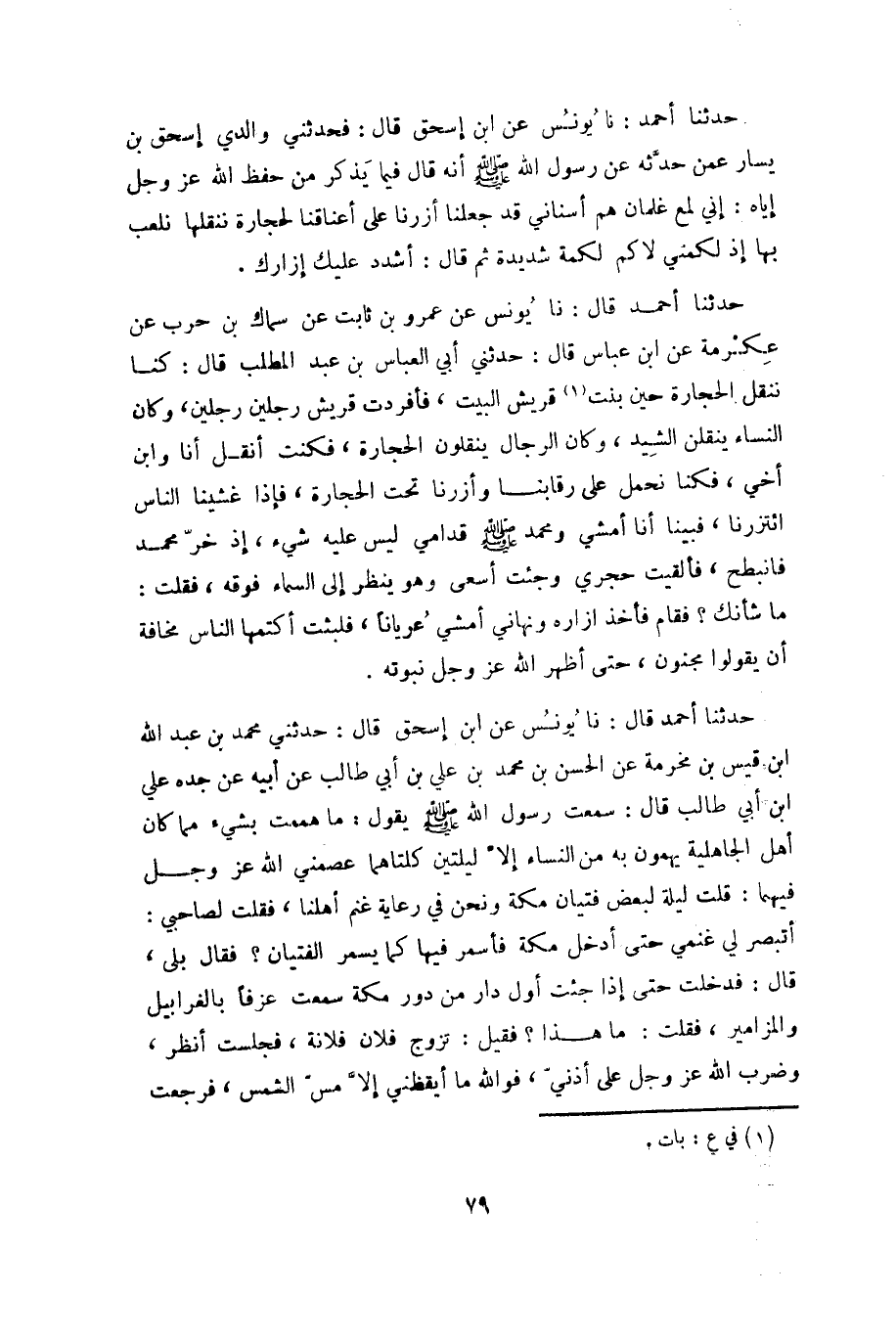 حدثنا أحمد قال: نا يونس عن عمرو بن ثابت عن سماك بن حرب عن عكرمة عن ابن عباس قال: حدثني أبي العباس بن عبد المطلب قال: كنا ننقل الحجارة حين بنت «1» قريش البيت، فأفردت قريش رجلين رجلين، وكان النساء ينقلن الشيد، وكان الرجال ينقلون الحجارة، فكنت أنقل أنا وابن أخي، فكنا نحمل على رقابنا وأزرنا تحت الحجارة، فإذا غشينا الناس ائتزرنا، فبينا أنا أمشي ومحمد صلى الله عليه وسلم قدامي ليس عليه شيء، إذ خر محمد فانبطح، فألقيت حجري وجئت أسعى وهو ينظر إلى السماء فوقه، فقلت: