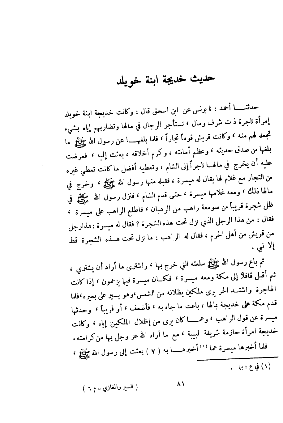 حدثنا أحمد: نا يونس عن ابن إسحق قال: وكانت خديجة ابنة خويلد إمرأة تاجرة ذات شرف ومال، تستأجر الرجال في مالها وتضاربهم إياه بشيء تجعله لهم منه، وكانت قريش قوماً تجاراً، فلما بلغها عن رسول الله صلى الله عليه وسلم ما بلغها من صدق حديثه، وعظم أمانته، وكرم أخلاقه، بعثت إليه، فعرضت عليه أن يخرج في مالها تاجرا إلى الشام، وتعطيه أفضل ما كانت تعطي غيره من التجار مع غلام لها يقال له ميسرة، فقبله منها رسول الله صلى الله عليه وسلّم، وخرج في مالها ذلك، ومعه غلامها ميسرة، حتى قدم الشام، فنزل رسول الله صلى الله عليه وسلم في ظل شجرة قريبا من صومعة راهب من الرهبان، فاطلع الراهب على ميسرة، فقال: من هذا الرجل الذي نزل تحت هذه الشجرة؟ فقال له ميسرة: هذا رجل من قريش من أهل الحرم، فقال له الراهب: ما نزل تحت هذه الشجرة قط إلا نبي.