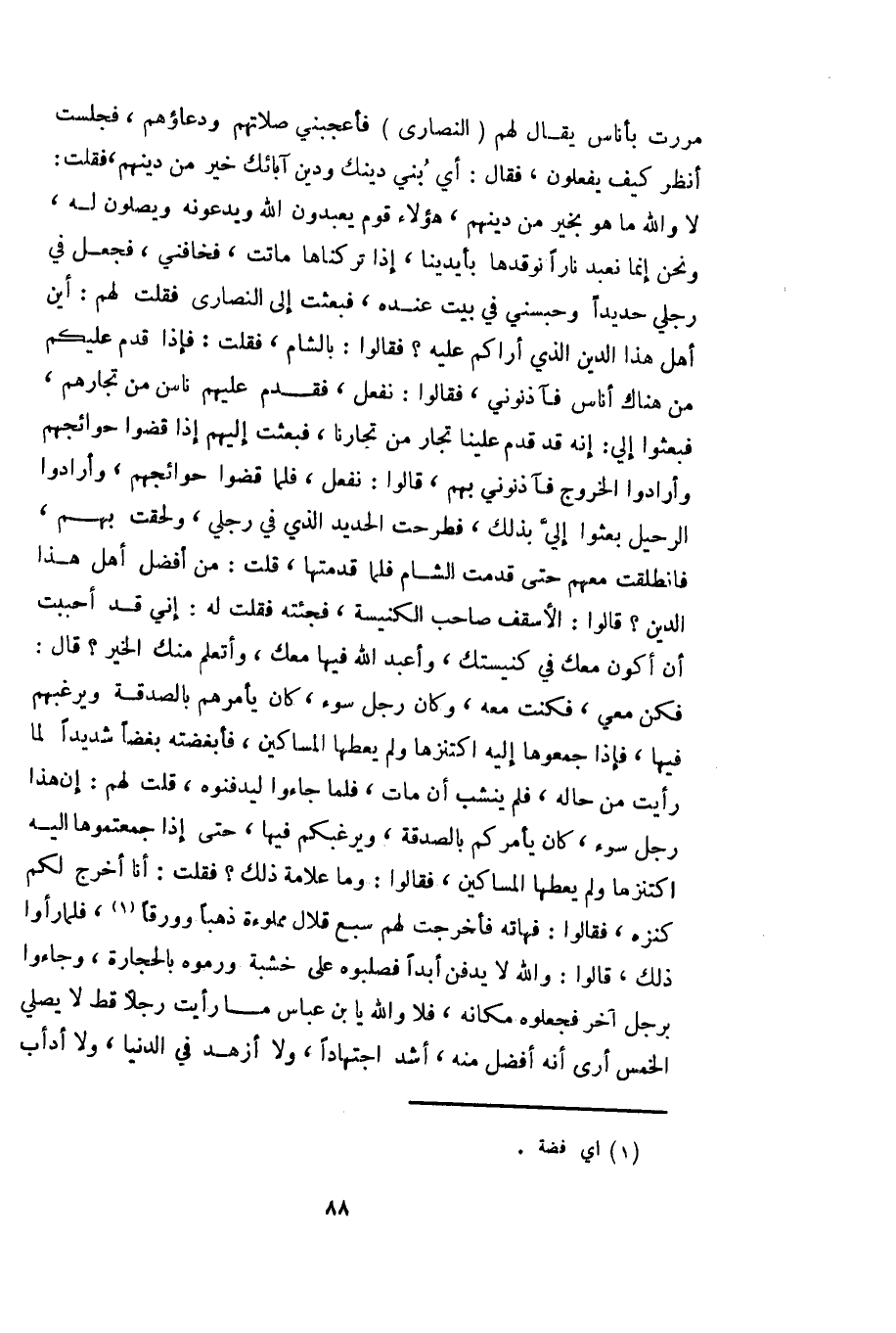 مررت بأناس يقال لهم (النصارى) فأعجبني صلاتهم ودعاؤهم، فجلست أنظر كيف يفعلون، فقال: أي بني دينك ودين آبائك خير من دينهم، فقلت: