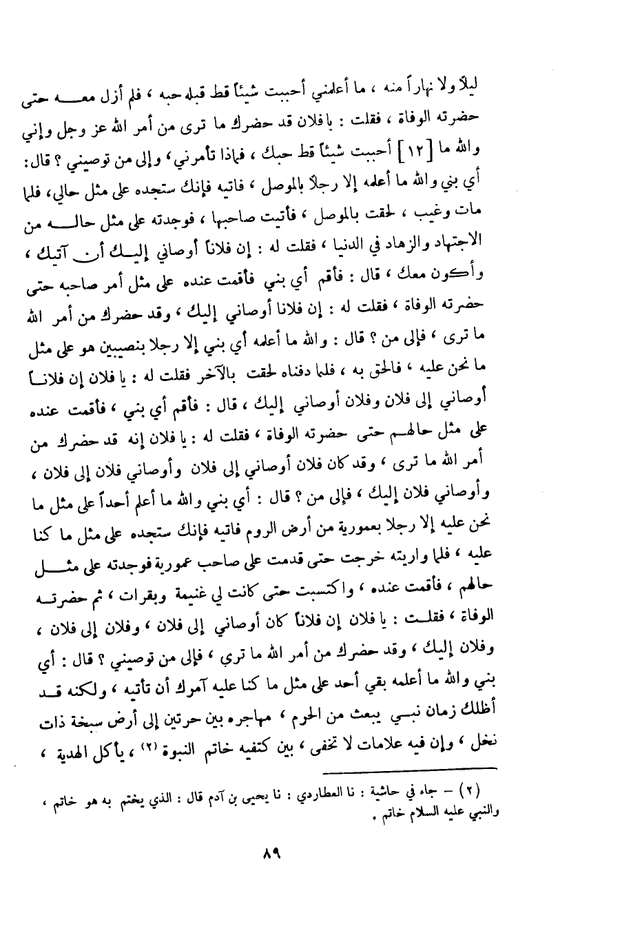 أي بني والله ما أعلمه إلا رجلاً بالموصل، فاتيه فإنك ستجده على مثل حالي، فلما مات وغيب، لحقت بالموصل، فأتيت صاحبها، فوجدته على مثل حاله من الاجتهاد والزهاد في الدنيا، فقلت له: إن فلاناً أوصاني إليك أن آتيك، وأكون معك، قال: فأقم أي بني فأقمت عنده على مثل أمر صاحبه حتى حضرته الوفاة، فقلت له: إن فلاناً أوصاني إليك، وقد حضرك من أمر الله ما ترى، فإلى من؟ قال: والله ما أعلمه أي بني إلا رجلاً بنصيبين هو على مثل ما نحن عليه، فالحق به، فلما دفناه لحقت بالآخر فقلت له: يا فلان إن فلاناً أوصاني إلى فلان وفلان أوصاني إليك، قال: فأقم أي بني، فأقمت عنده على مثل حالهم حتى حضرته الوفاة، فقلت له: يا فلان إنه قد حضرك من أمر الله ما ترى، وقد كان فلان أوصاني إلى فلان وأوصاني فلان إلى فلان، وأوصاني فلان إليك، فإلى من؟ قال: أي بني والله ما أعلم أحدأ على مثل ما نحن عليه إلا رجلاً بعمورية من أرض الروم فاتيه فإنك ستجده على مثل ما كنا عليه، فلما واريته خرجت حتى قدمت على صاحب عمورية فوجدته على مثل حالهم، فأقمت عنده، واكتسبت حتى كانت لي غنيمة وبقرات، ثم حضرته الوفاة، فقلت: يا فلان إن فلاناً كان أوصاني إلى فلان، وفلان إلى فلان، وفلان إليك، وقد حضرك من أمر الله ما ترى، فإلى من توصيني؟ قال: أي بني والله ما أعلمه بقي أحد على مثل ما كنا عليه آمرك أن تأتيه، ولكنه قد أظلك زمان نبي يبعث من الحرم، مهاجره بين حرتين إلى أرض سبخة ذات نخل، وإن فيه علامات لا تخفى، بين كتفيه خاتم النبوة «2» ، يأكل الهدية،