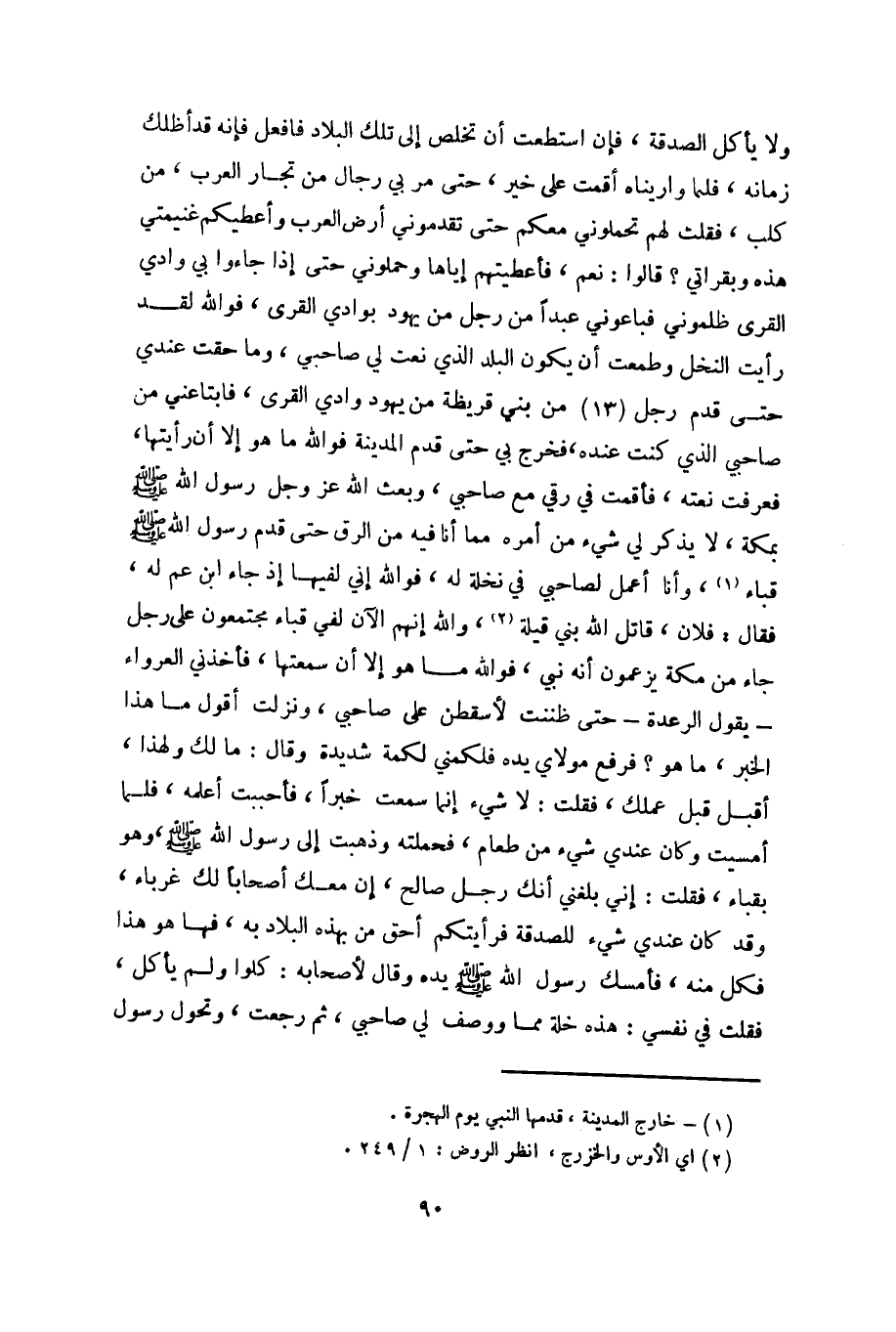 ولا يأكل الصدقة، فإن استطعت أن تخلص إلى تلك البلاد فافعل فإنه قد أظلك زمانه، فلما واريناه أقمت على خير، حتى مر بي رجال من تجار العرب، من كلب، فقلت لهم تحملوني معكم حتى تقدموني أرض العرب وأعطيكم غنيمتي هذه وبقراتي؟ قالوا: نعم، فأعطيتهم إياها وحملوني حتى إذا جاءوا بي وادي القرى ظلموني فباعوني عبداً من رجل من يهود بوادي القرى، فو الله لقد رأيت النخل وطمعت أن يكون البلد الذي نعت لي صاحبي، وما حقت عندي حتى قدم رجل (13) من بني قريظة من يهود وادي القرى، فابتاعني من صاحبي الذي كنت عنده، فخرج بي حتى قدم المدينة فو الله ما هو إلا أن رأيتها، فعرفت نعته، فأقمت في رقي مع صاحبي، وبعث الله عز وجل رسول الله صلى الله عليه وسلم بمكة، لا يذكر لي شيء من أمره مما أنا فيه من الرق حتى قدم رسول الله صلى الله عليه وسلم قباء «1» ، وأنا أعمل لصاحبي في نخلة له، فو الله إني لفيها إذ جاء ابن عم له، فقال: فلان، قاتل الله بني قيلة «2» ، والله إنهم الآن لفي قباء مجتمعون على رجل جاء من مكة يزعمون أنه نبي، فو الله ما هو إلا أن سمعتها، فأخذني العرواء- يقول الرعدة- حتى ظننت لأسقطن على صاحبي، ونزلت أقول ما هذا الخبر، ما هو؟ فرفع مولاي يده فلكمني لكمة شديدة وقال: ما لك ولهذا، أقبل قبل عملك، فقلت: لا شيء إنما سمعت خبراً، فأحببت أعلمه، فلما أمسيت وكان عندي شيء من طعام، فحملته وذهبت إلى رسول الله صلى الله عليه وسلم، وهو بقباء، فقلت: إني بلغني أنك رجل صالح، إن معك أصحاباً لك غرباء، وقد كان عندي شيء للصدقة فرأيتكم أحق من بهذه البلاد به، فها هو هذا فكل منه، فأمسك رسول الله صلى الله عليه وسلم يده وقال لأصحابه: كلوا ولم يأكل، فقلت في نفسي: هذه خلة مما ووصف لي صاحبي، ثم رجعت، وتحول رسول