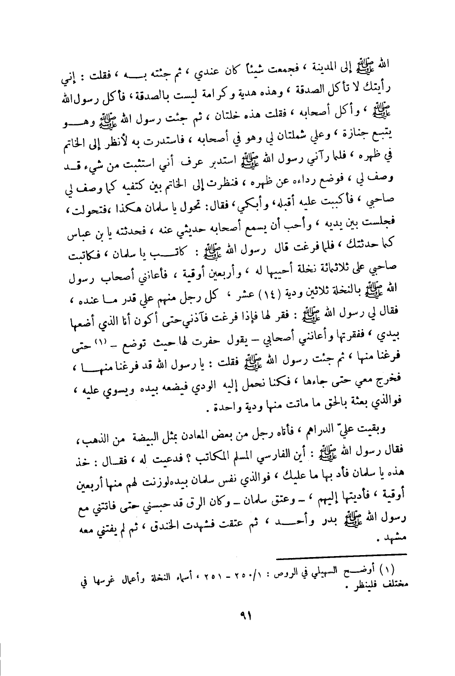 الله صلى الله عليه وسلم إلى المدينة، فجمعت شيئاً كان عندي، ثم جئته به، فقلت: إني رأيتك لا تأكل الصدقة، وهذه هدية وكرامة ليست بالصدقة، فأكل رسول الله صلى الله عليه وسلم، وأكل أصحابه، فقلت هذه خلتان، ثم جئت رسول الله صلى الله عليه وسلم وهو يتبع جنازة، وعلي شملتان لي وهو في أصحابه، فاستدرت به لأنظر إلى الخاتم في ظهره، فلما رآني رسول الله صلى الله عليه وسلم استدبر عرف أني استثبت من شيء قد وصف لي، فوضع رداءه عن ظهره، فنظرت إلى الخاتم بين كتفيه كما وصف لي صاحبي، فأكببت عليه أقبله، وأبكي، فقال: تحول يا سلمان هكذا، فتحولت، فجلست بين يديه، وأحب أن يسمع أصحابه حديثي عنه، فحدثته يابن عباس كما حدثتك، فلما فرغت قال رسول الله صلى الله عليه وسلم: كاتب يا سلمان، فكاتبت صاحبي على ثلاثمائة نخلة أحييها له، وأربعين أوقية، فأعانني أصحاب رسول الله صلى الله عليه وسلم بالنخلة ثلاثين ودية (14) عشر، كل رجل منهم على قدر ما عنده، فقال لي رسول الله صلى الله عليه وسلم: فقر لها فإذا فرغت فآذني حتى أكون أنا الذي أضعها بيدي، ففقرتها وأعانني أصحابي- يقول حفرت لها حيث توضع- «1» حتى فرغنا منها، ثم جئت رسول الله صلى الله عليه وسلم فقلت: يا رسول الله قد فرغنا منها، فخرج معي حتى جاءها، فكنا نحمل إليه الودي فيضعه بيده ويسوي عليه، فو الذي بعثه بالحق ما ماتت منها ودية واحدة.